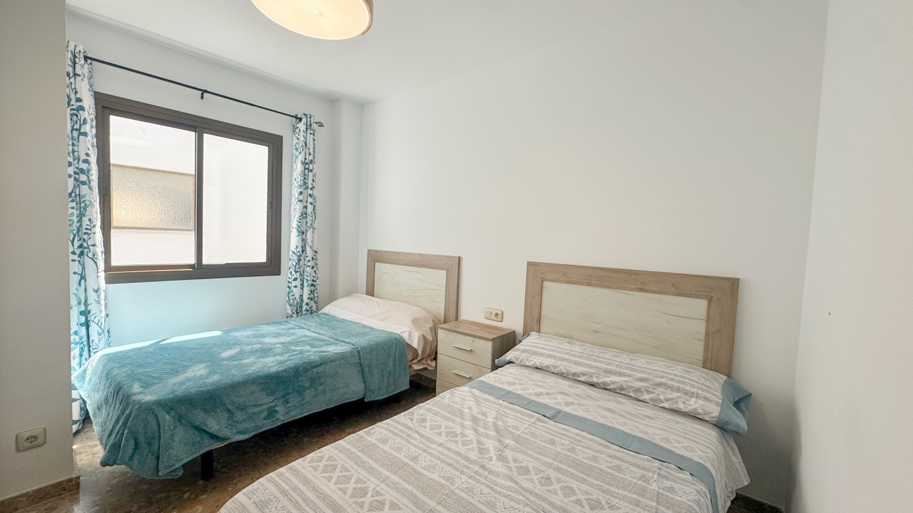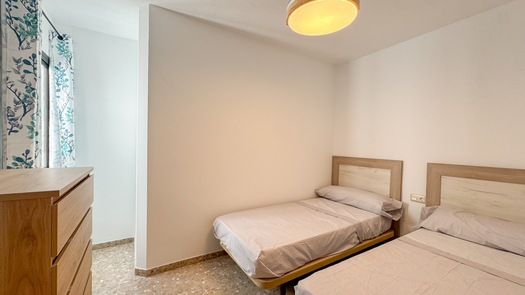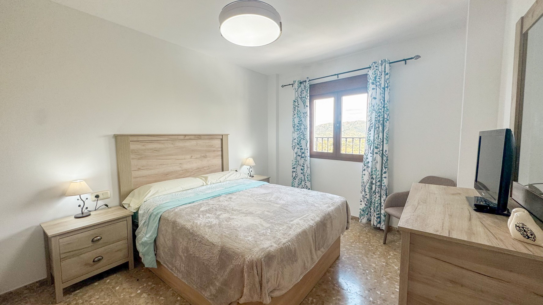 Tres dormitorios bien equipados garantizan noches de descanso: un dormitorio principal con una cama doble y TV, además de dos dormitorios adicionales con camas individuales, todos ofreciendo amplio almacenamiento a través de armarios y cajones. El espacioso baño familiar está completo con bañera y bidé.
