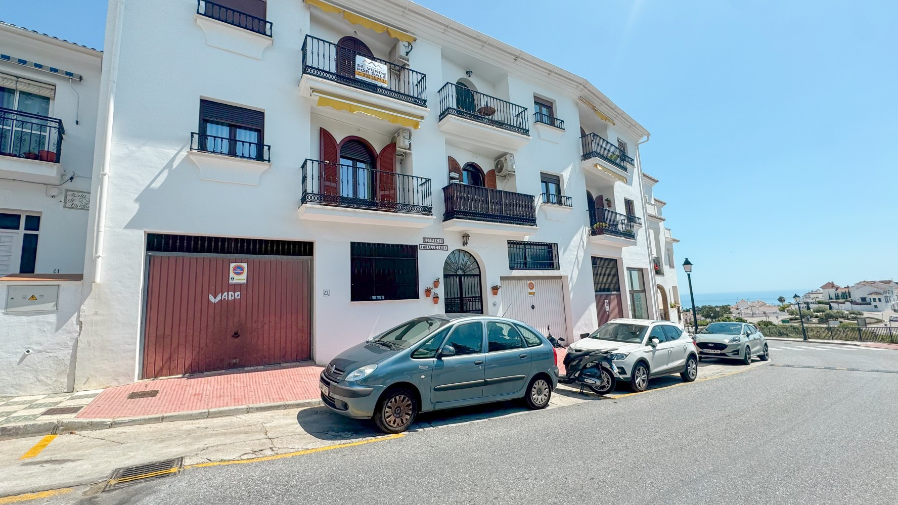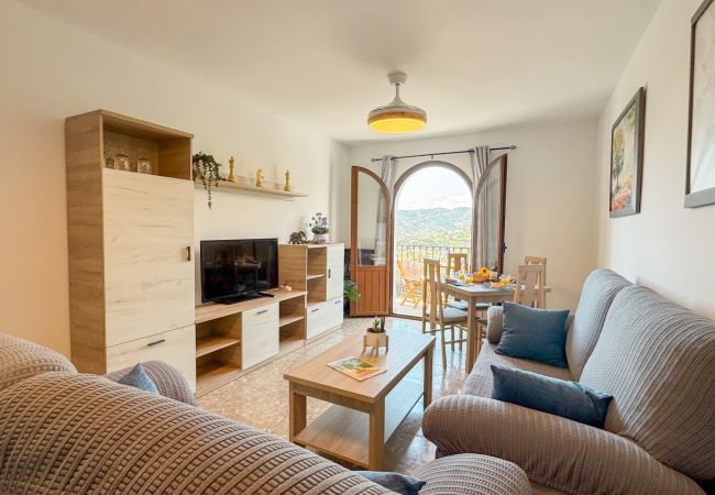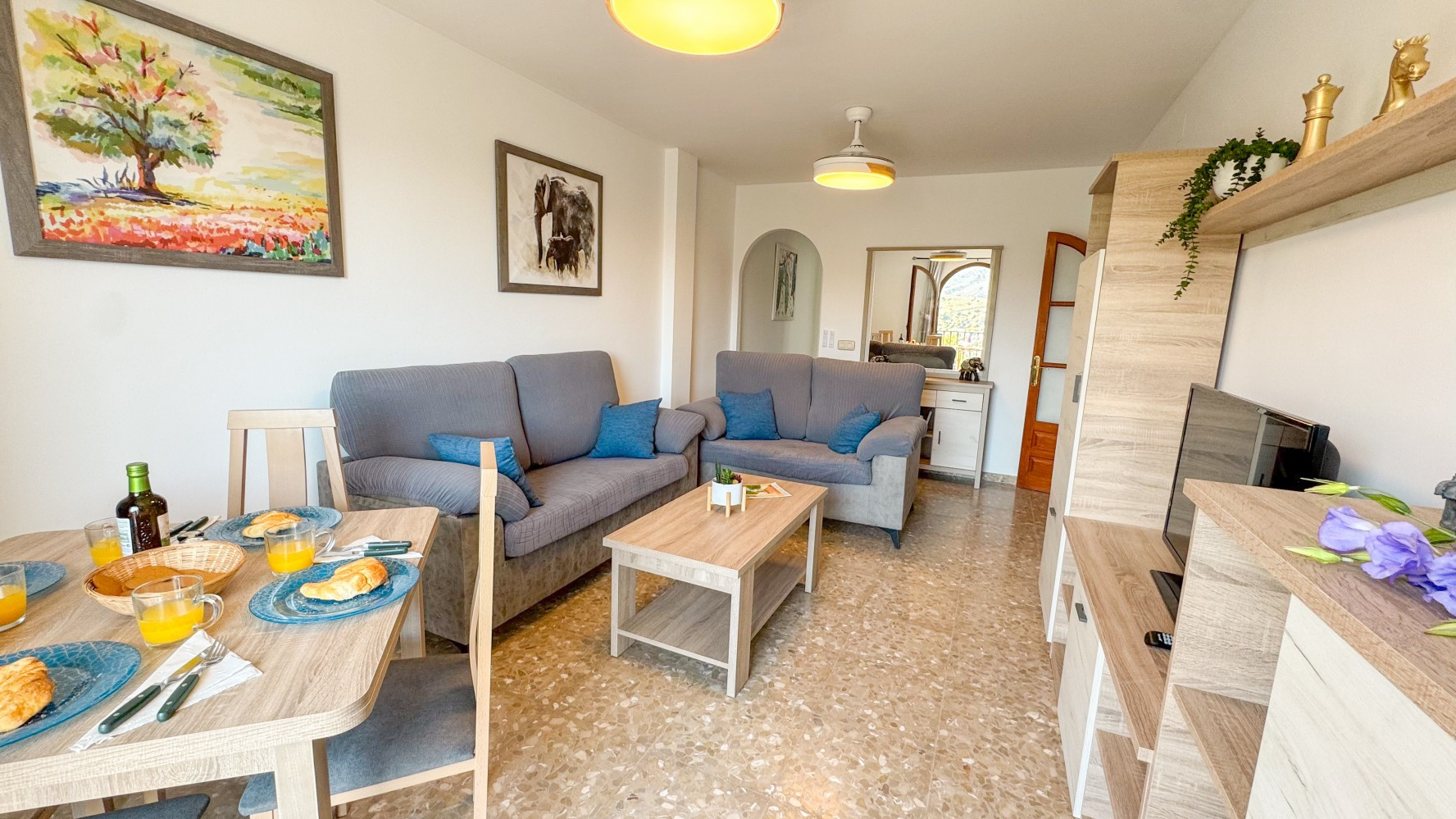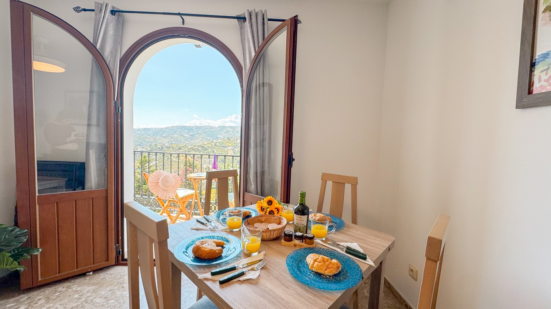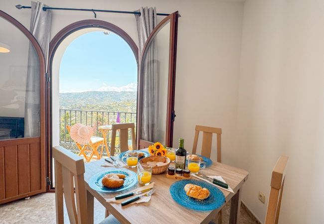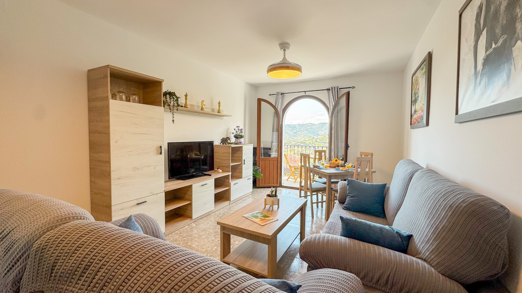 Una sala de estar luminosa y espaciosa con sofás cómodos, un área de comedor y un televisor, mientras las puertas corredizas se abren a un balcón orientado al oeste, un lugar ideal para relajarse con bebidas vespertinas mientras el sol baña las montañas de la Sierra de Almijara y los tejados de las casas blancas del pueblo con luz dorada.