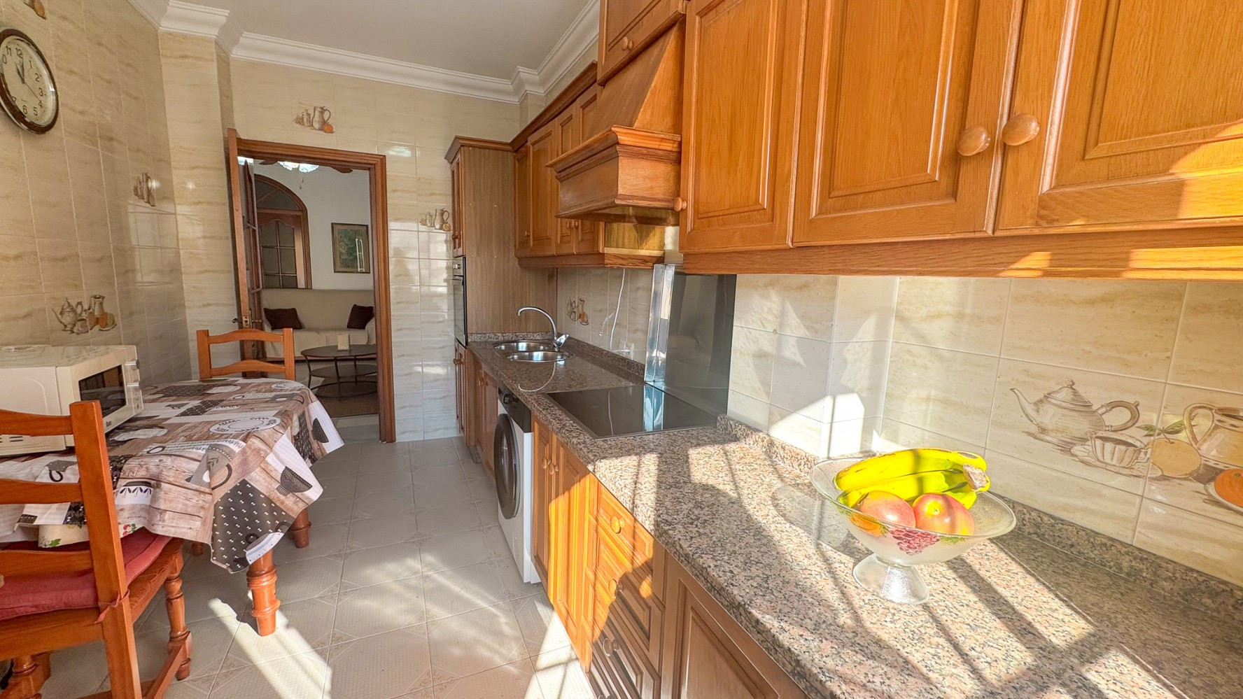 Cocina grande totalmente equipada con horno, placa de cocina, lavadora, frigorífico congelador, encimeras de granito, gran mesa de comedor.