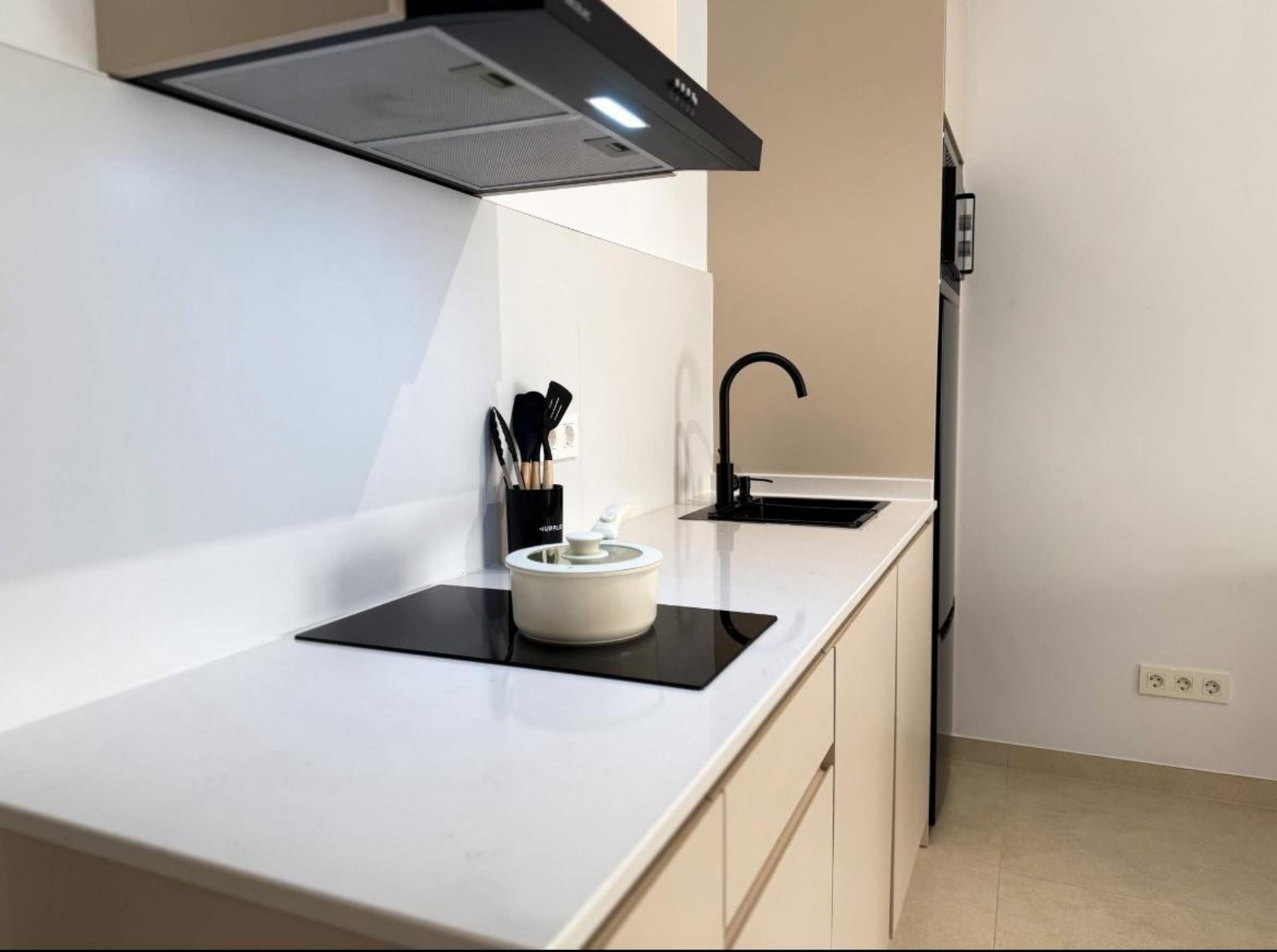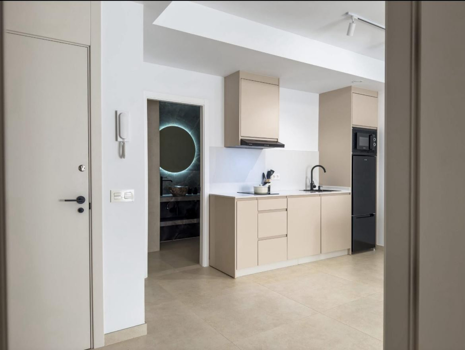 Entra en la sala de estar moderna inundada de luz natural desde una gran ventana con vista a la calle de abajo. La cocina de planta abierta está completamente equipada con comodidades modernas que incluyen placa vitrocerámica, horno y microondas.