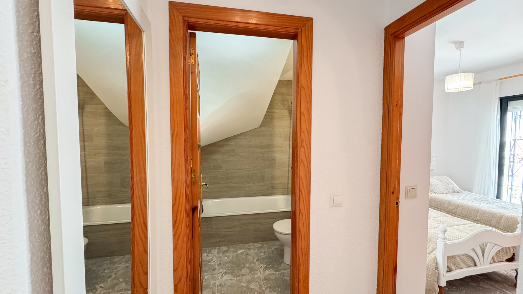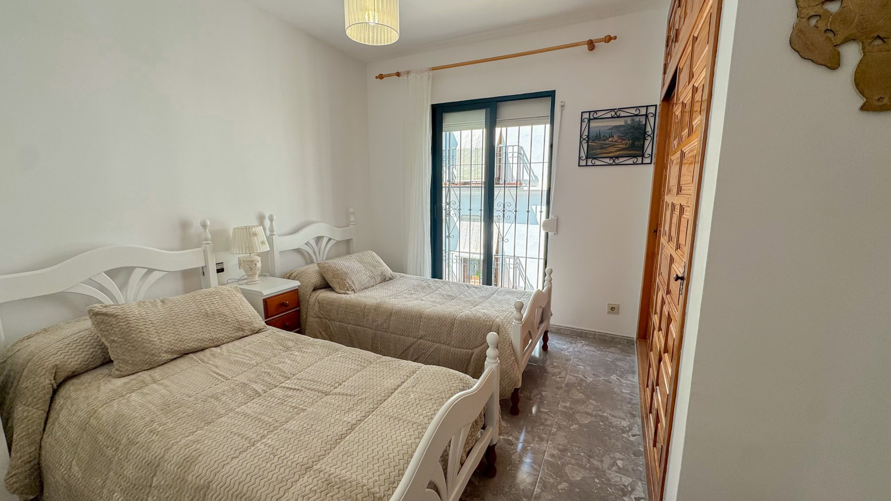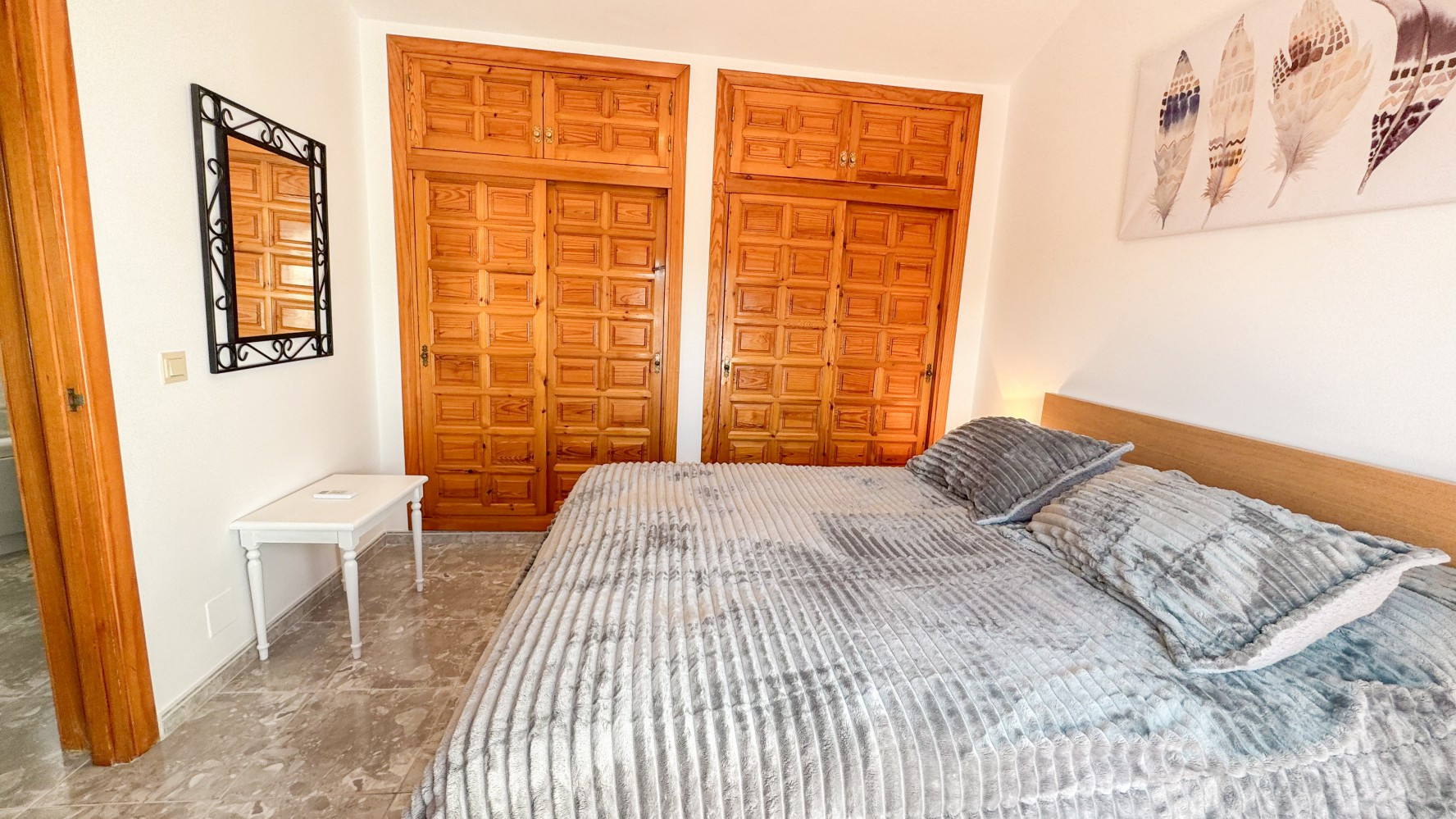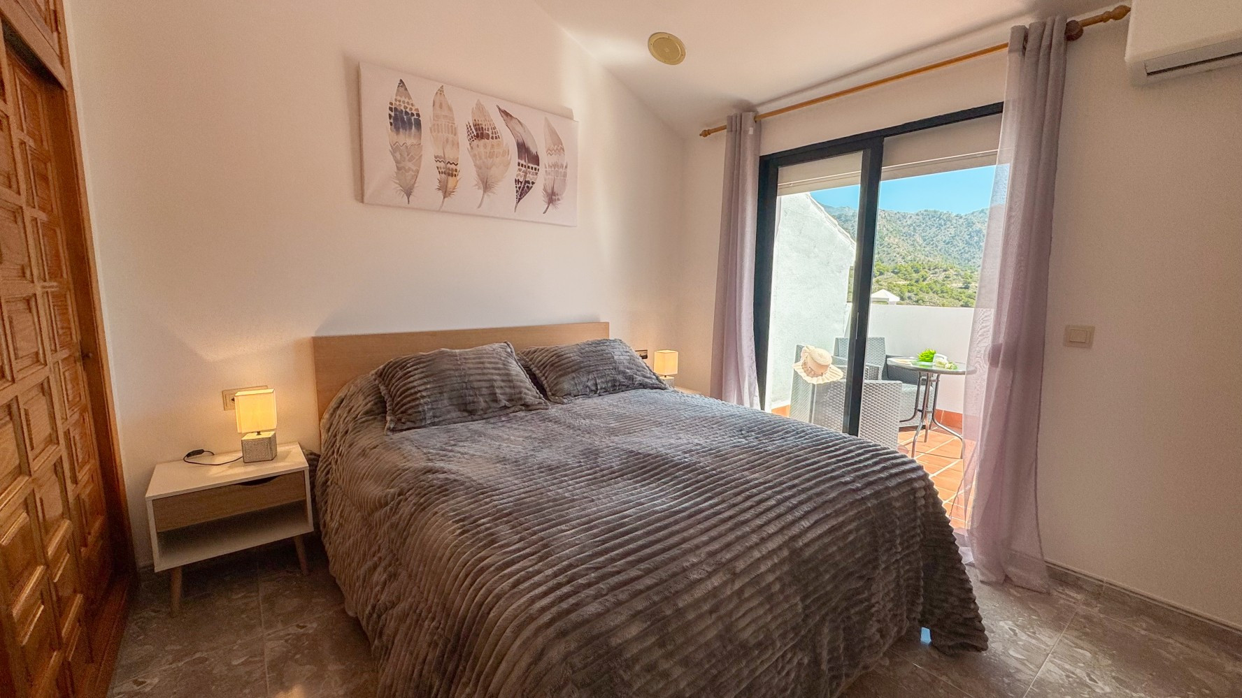 Planta Superior: Dormitorio doble con aire acondicionado, armarios empotrados y acceso directo a la terraza.