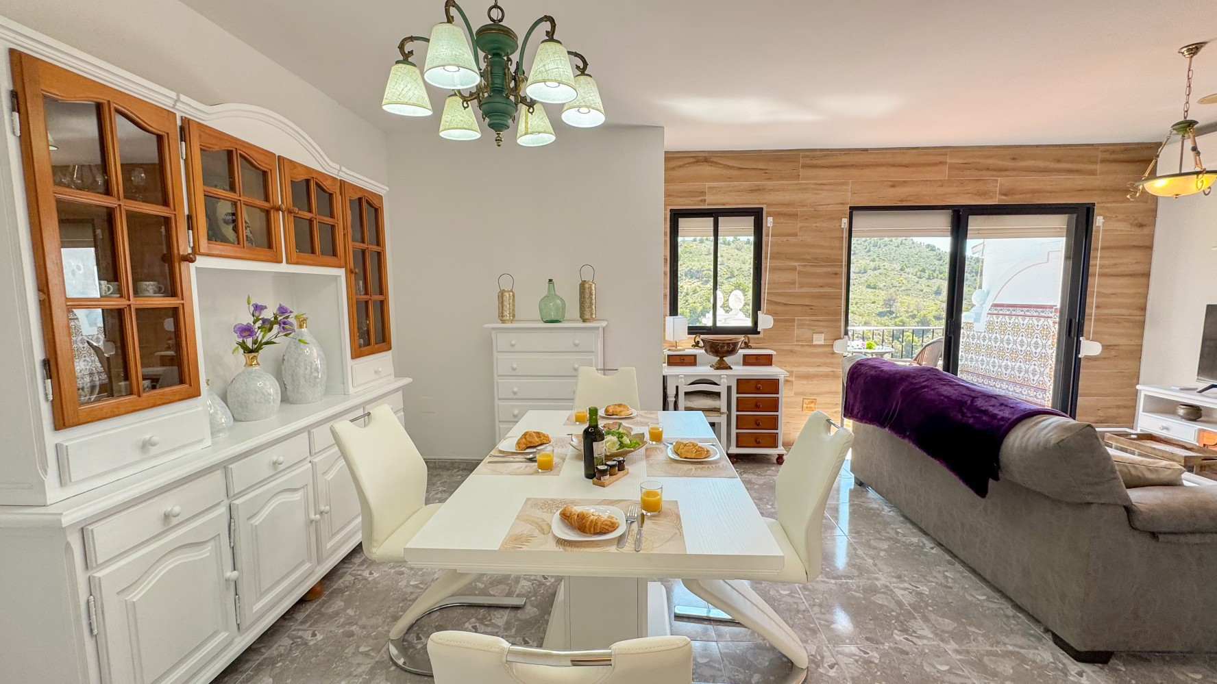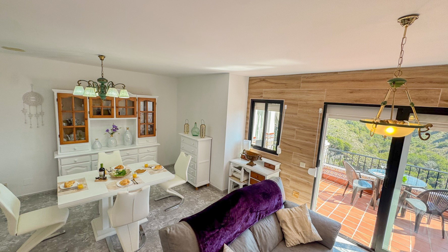 Un salón acogedor con zona de comedor, TV y un espacio de trabajo dedicado para días de trabajo remoto y aire acondicionado. Acceso a una de las terrazas privadas con impresionantes vistas.