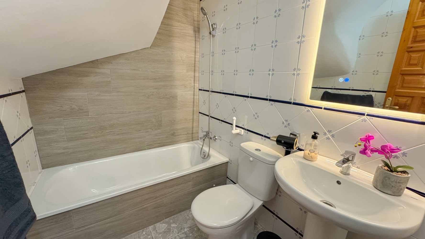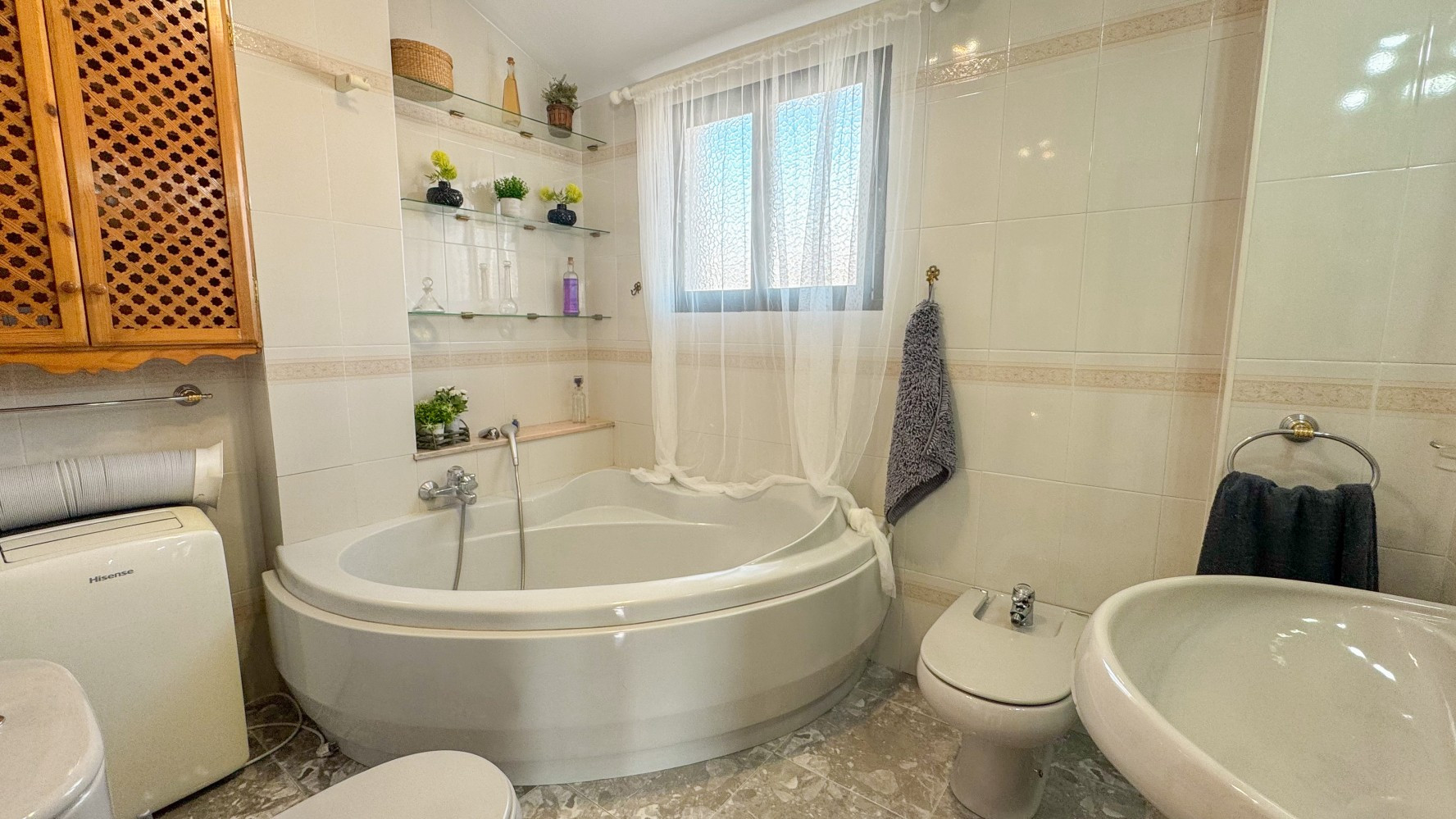 Relájate en la bañera de la planta baja o en la bañera de la esquina del piso superior después de un día de exploración.