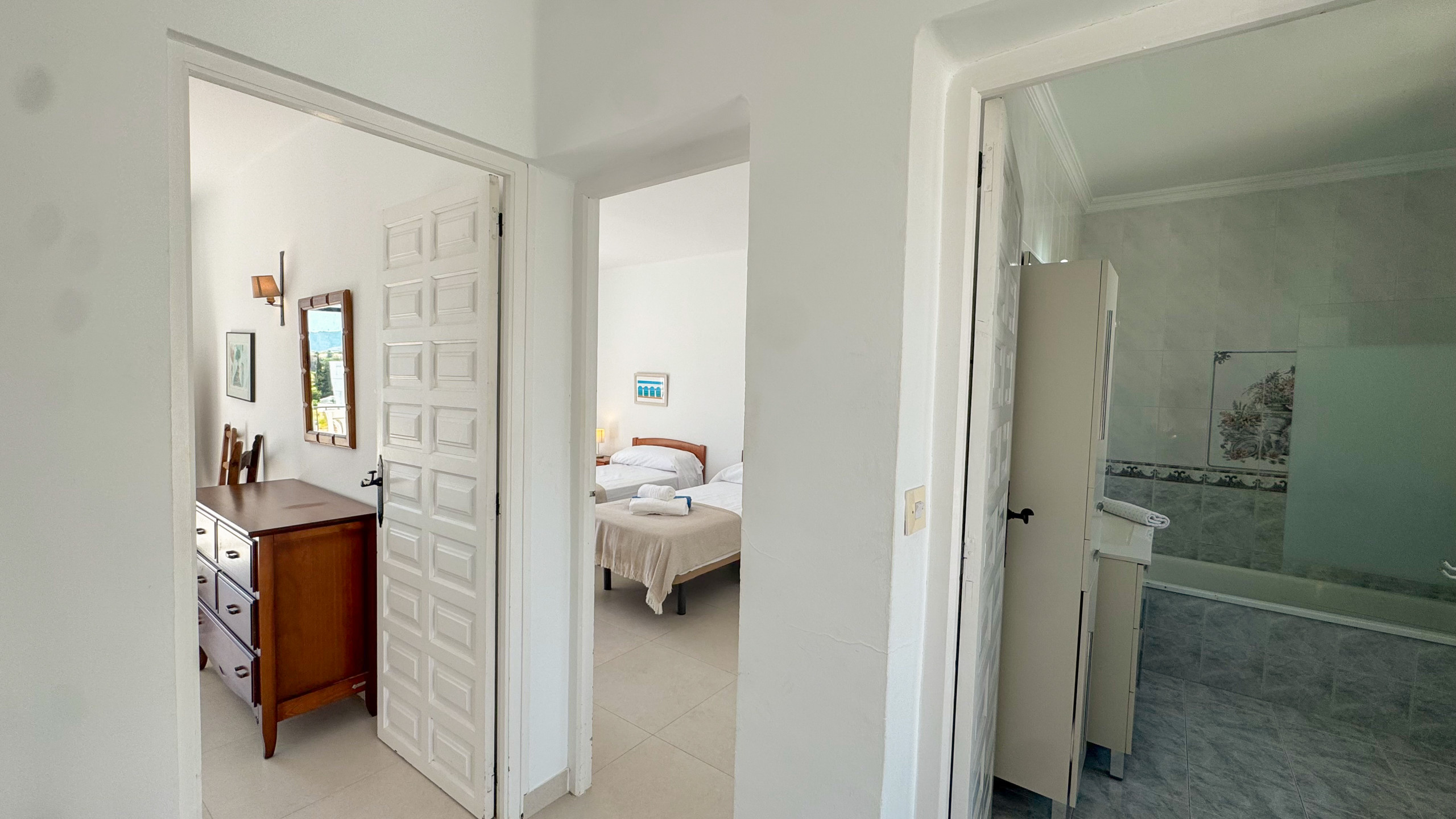 En la segunda planta hay dos dormitorios; el principal con una cama de matrimonio con acceso a un balcón y el segundo con dos camas individuales y también con acceso a un pequeño balcón. Un baño familiar con ducha de paseo.