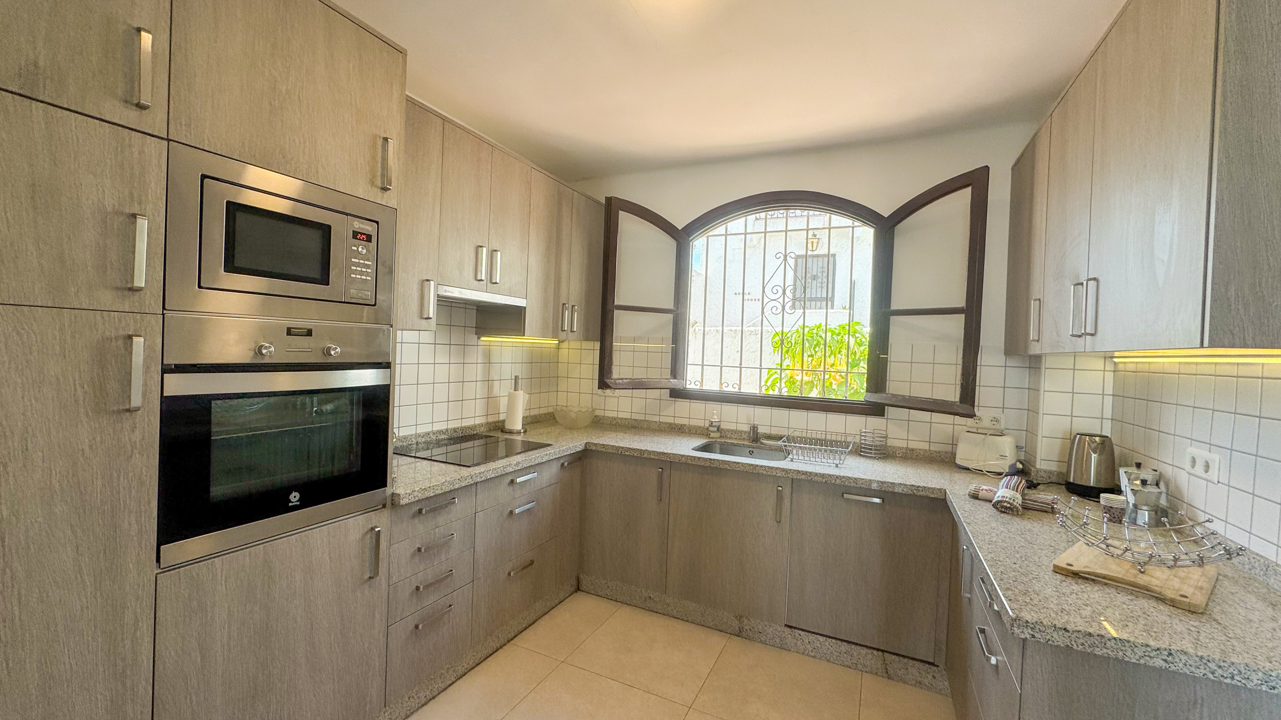 La cocina independiente, de inducción, está equipada con nevera, microondas, horno, congelador, lavavajillas, vajilla/cubertería, utensilios/cocina, cafetera, tostadora y hervidor de agua.