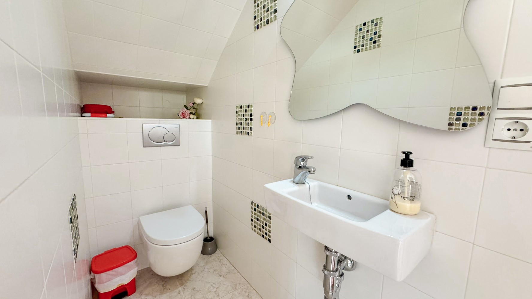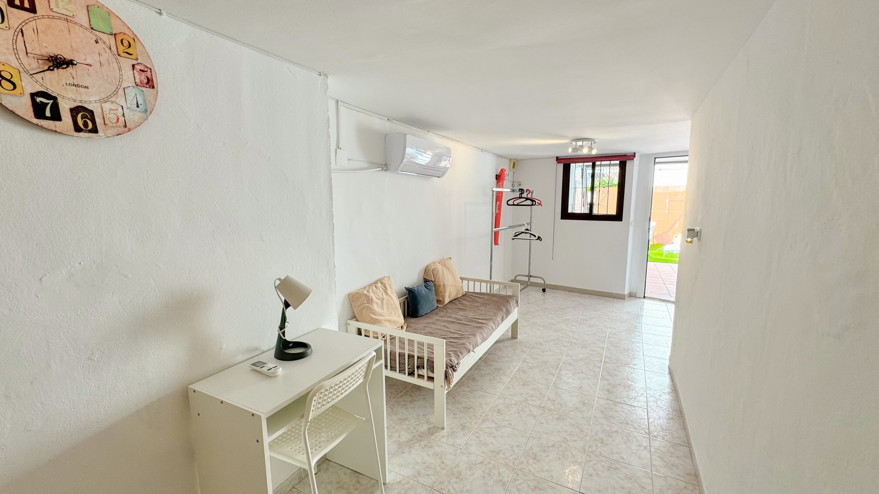 En la primera planta hay un luminoso salón con acceso a una agradable terraza y a una zona de solárium a través de unos escalones. Cocina de planta abierta y totalmente equipada y un aseo.
