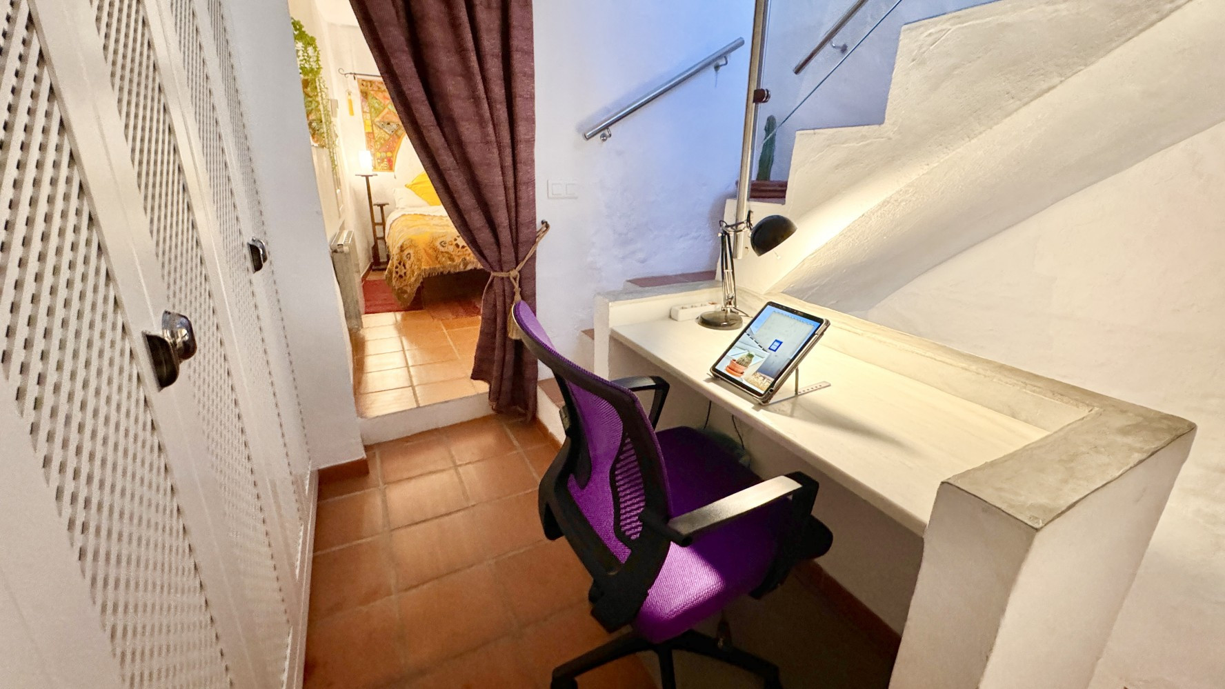 Desde este rellano tienes 2 escaleras, una para subir directamente a la espaciosa sala de estar con mucha luz natural, y un área separada pequeña con un escritorio, ideal para trabajar desde casa. Grandes armarios. La 2ª habitación con cama de matrimonio.