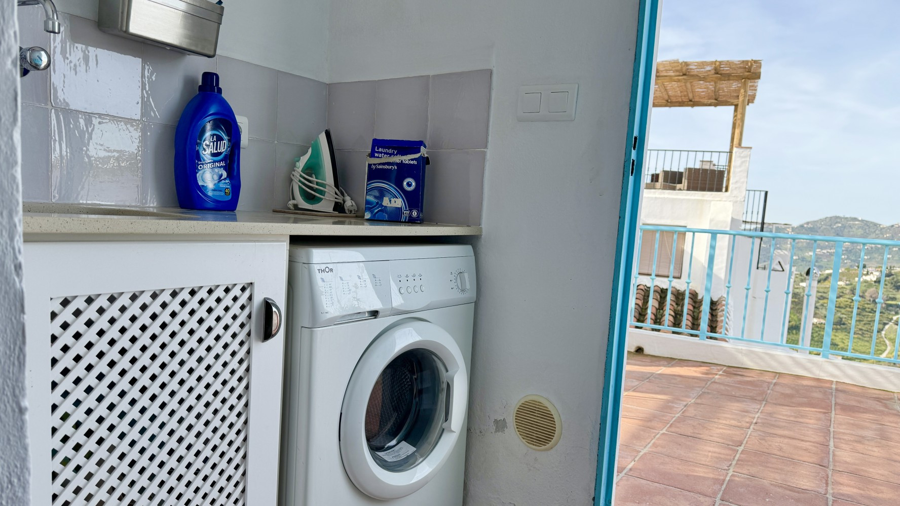 Desde la terraza encontrarás una puerta que te lleva al área de servicio, y esta conduce de vuelta al pasillo donde está la habitación doble.