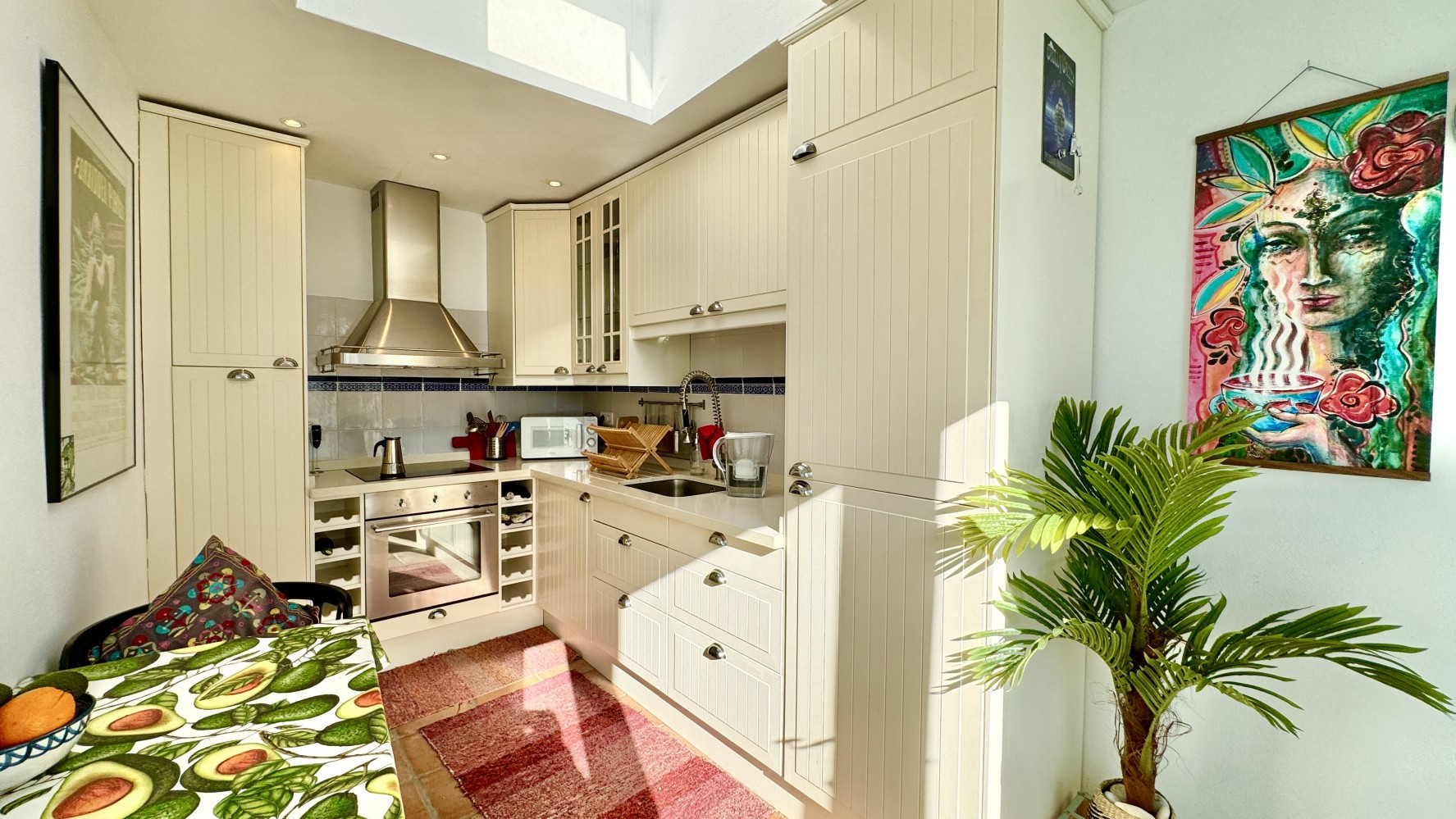 Y el otro te llevará a través de un pasillo hasta la cocina muy bien equipada, con horno, placa de inducción, microondas, frigorífico congelador, tostadora y hervidor.