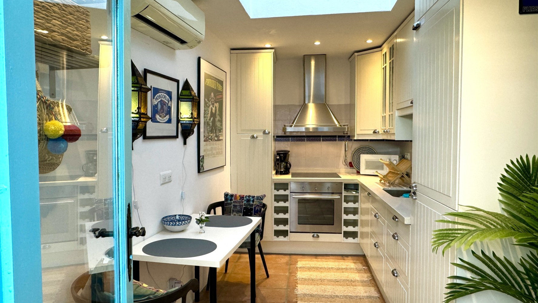 La cocina tiene aire acondicionado instalado.
