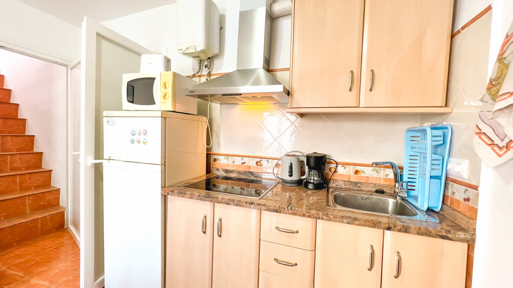 Y el otro te llevará a través de un pasillo hasta la cocina muy bien equipada, con horno, placa de inducción, microondas, frigorífico congelador, tostadora y hervidor.
