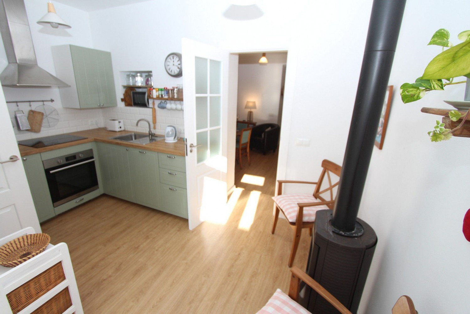 El interior acogedor cuenta con una amplia zona de estar calentada por una estufa rústica de pellets. La cocina luminosa y bien equipada incluye acceso a la terraza donde puedes disfrutar de tu café de la mañana. Dos cuartos de baño con ducha prácticos dan servicio a la casa, mientras que los dormitorios de la planta superior cuentan con aire acondicionado para tu comodidad.