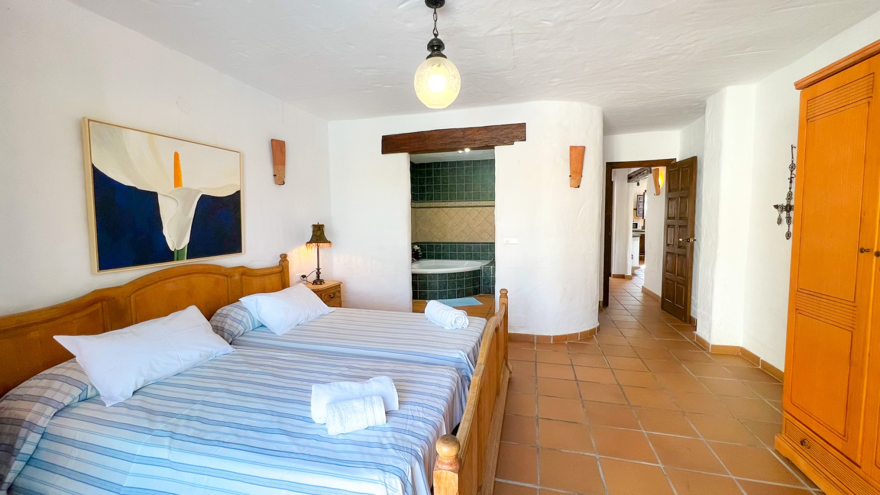 Con dos dormitorios y dos baños familiares con bañeras. El dormitorio principal ofrece acceso directo a la terraza y a la piscina privada.
