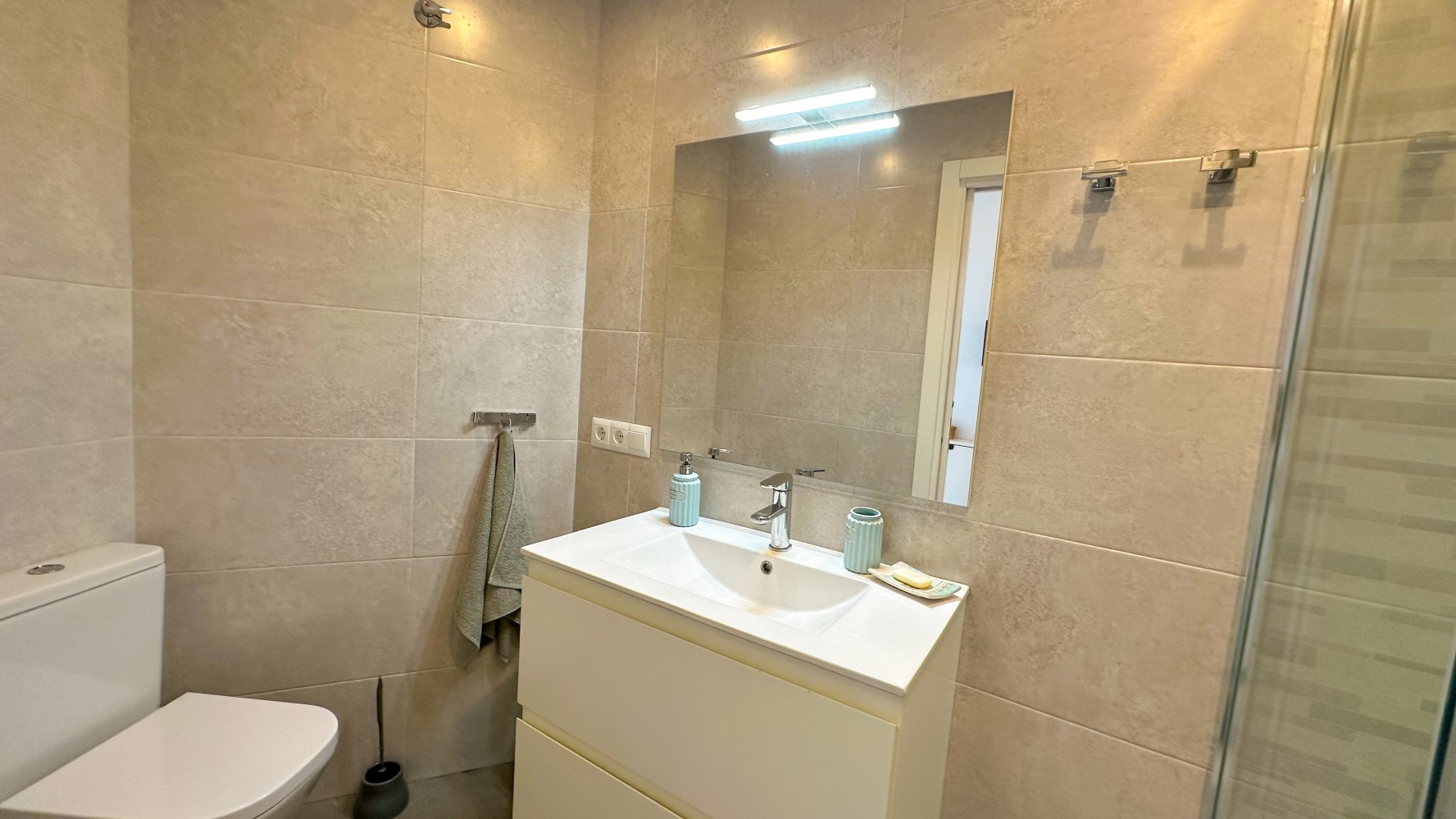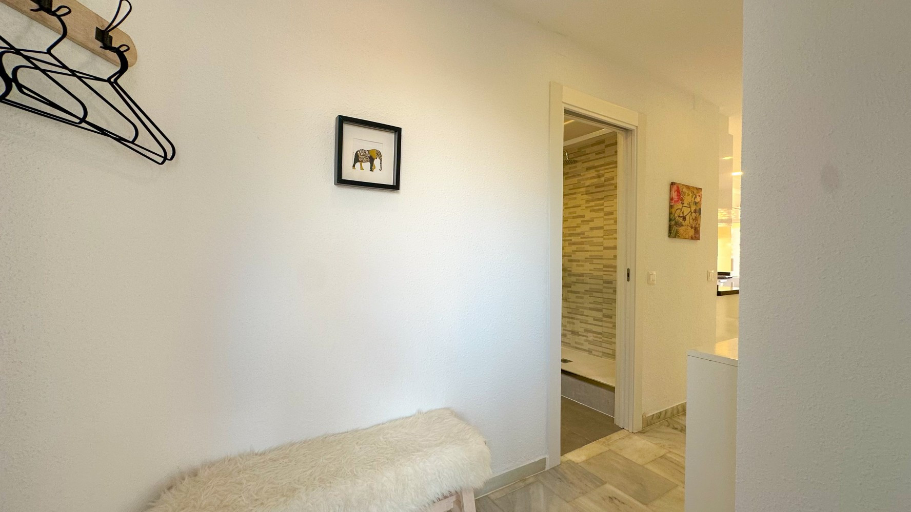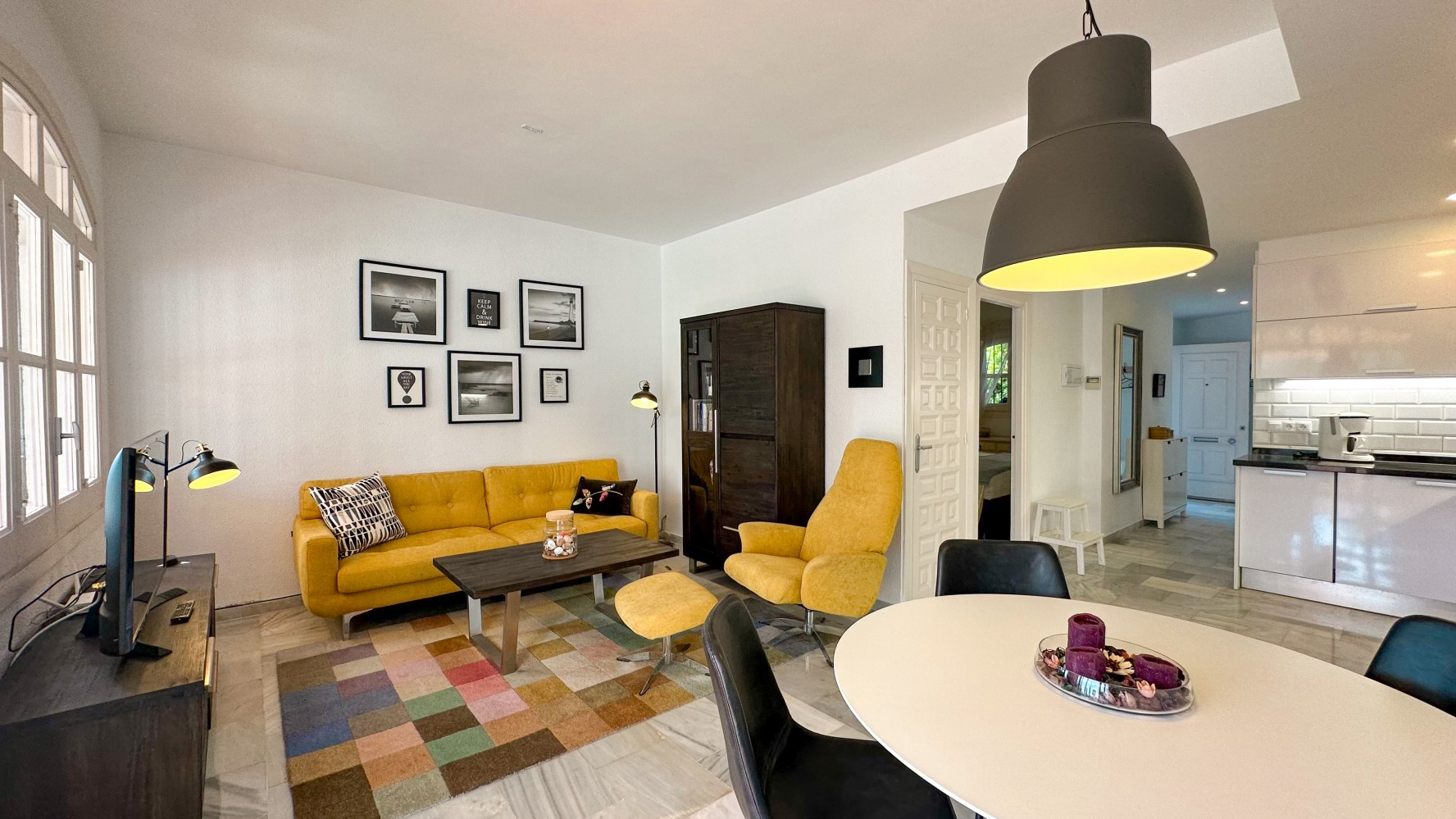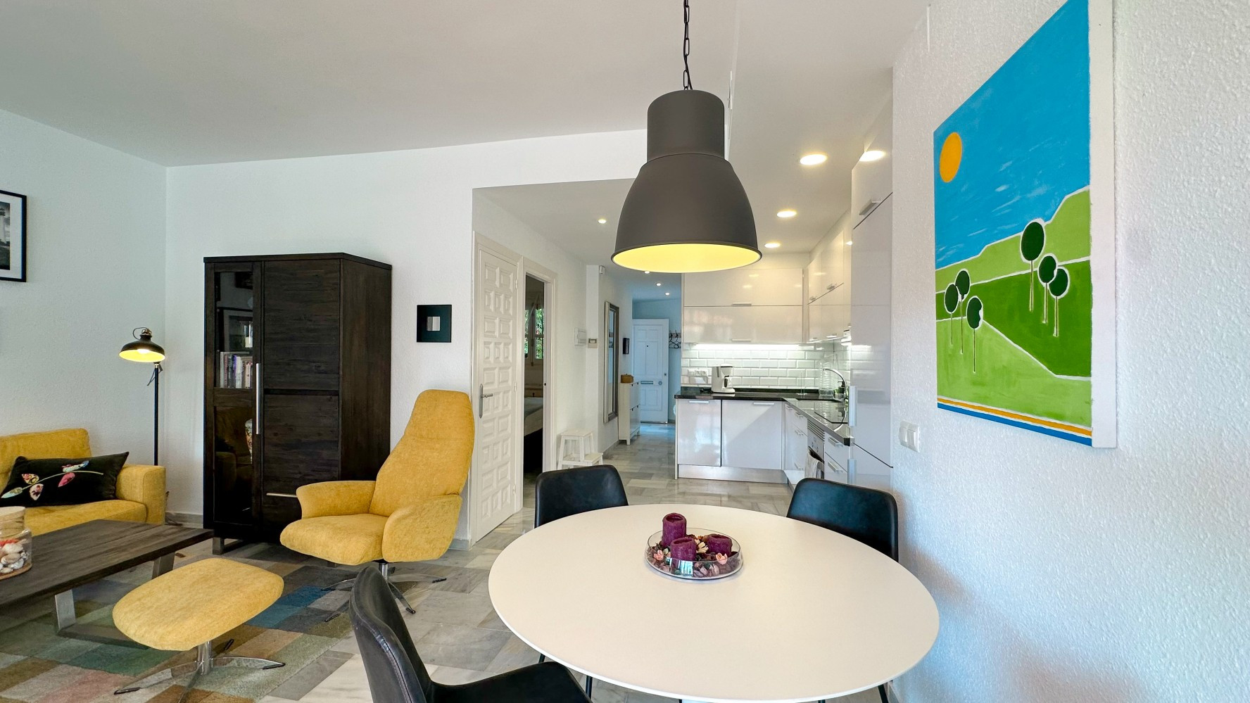 The bright and airy living-dining area seamlessly connects to a well-equipped kitchen, providing everything you need for a comfortable stay. The bathroom includes a modern shower, ensuring convenience for all guests.