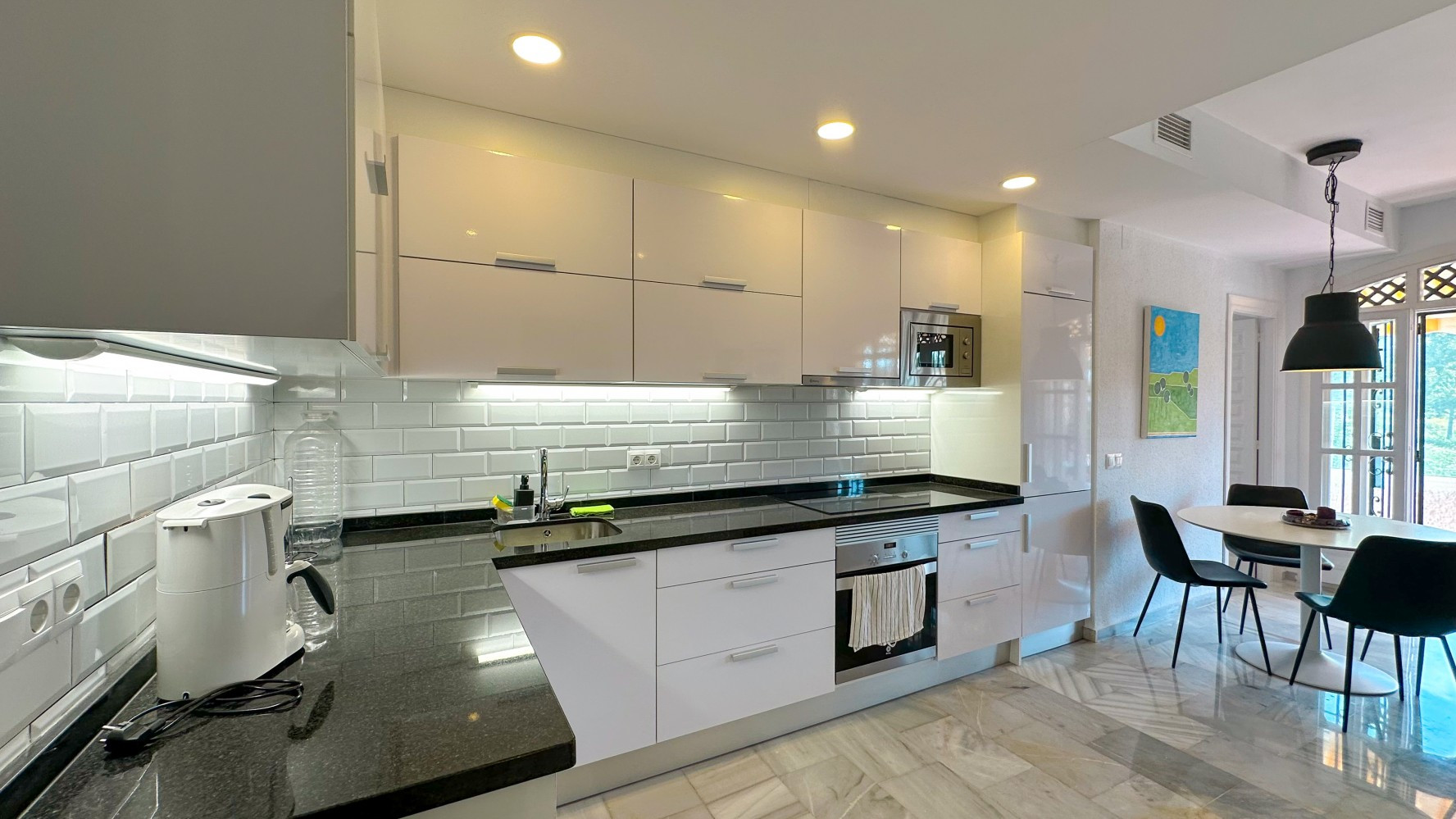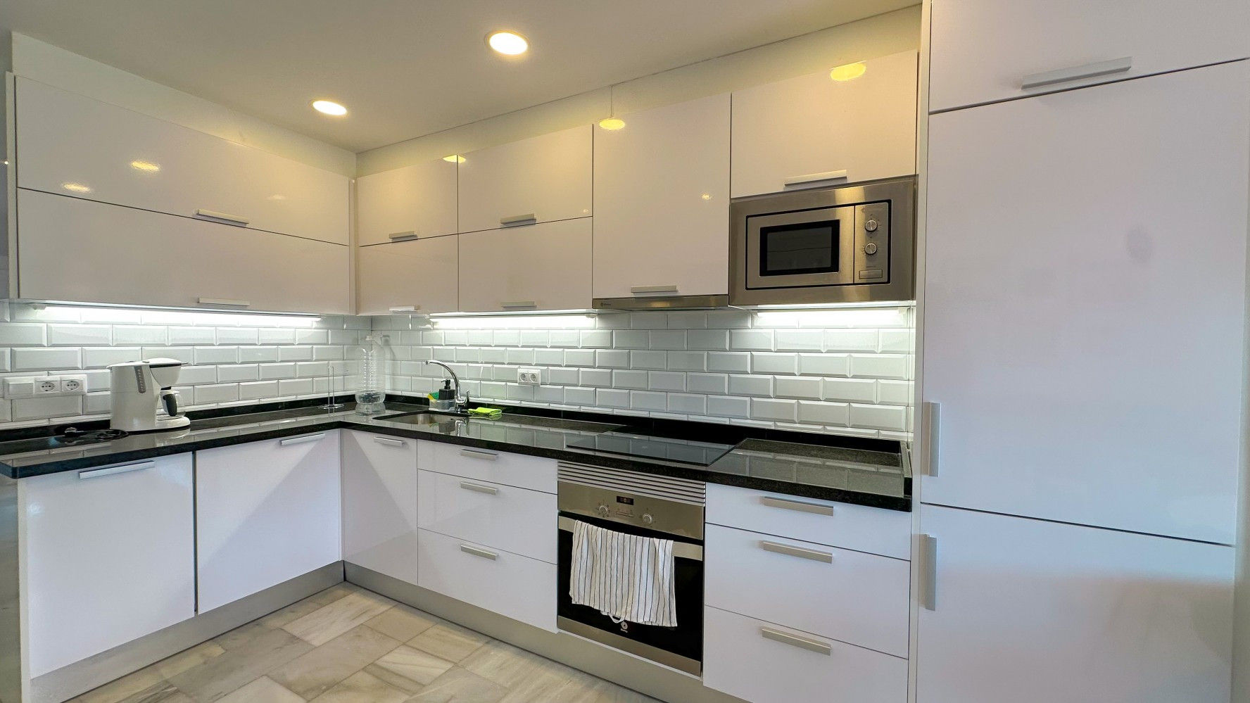 The fully equipped kitchen, complete with a washing machine and dishwasher, provides all the necessities for a hassle-free stay.