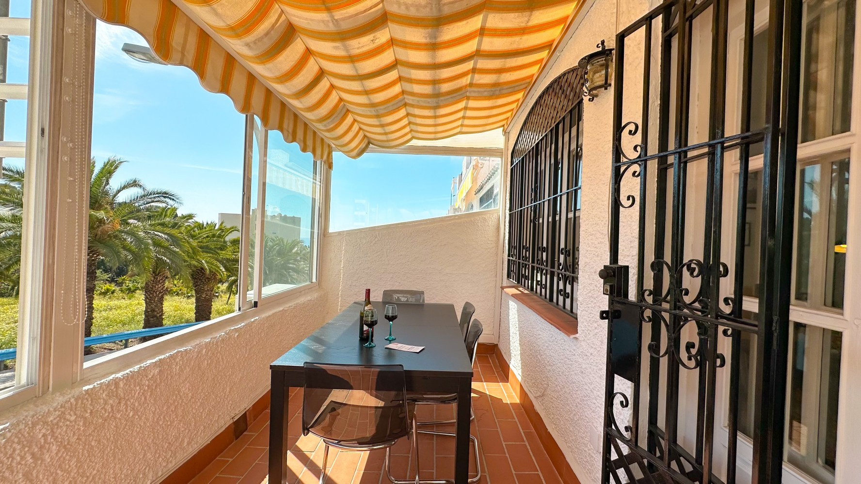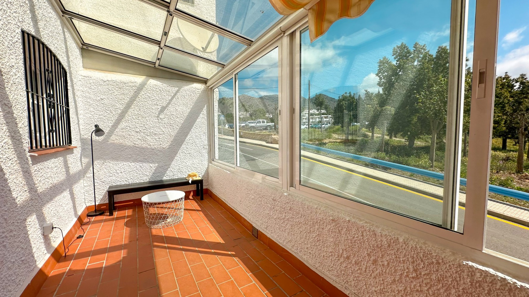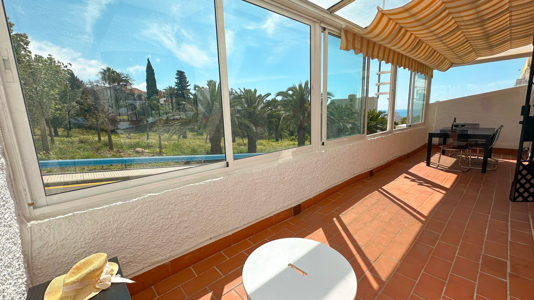 The spacious glassed terrace welcomes the morning sun, providing a perfect spot to start your day with a glimpse of the sea.