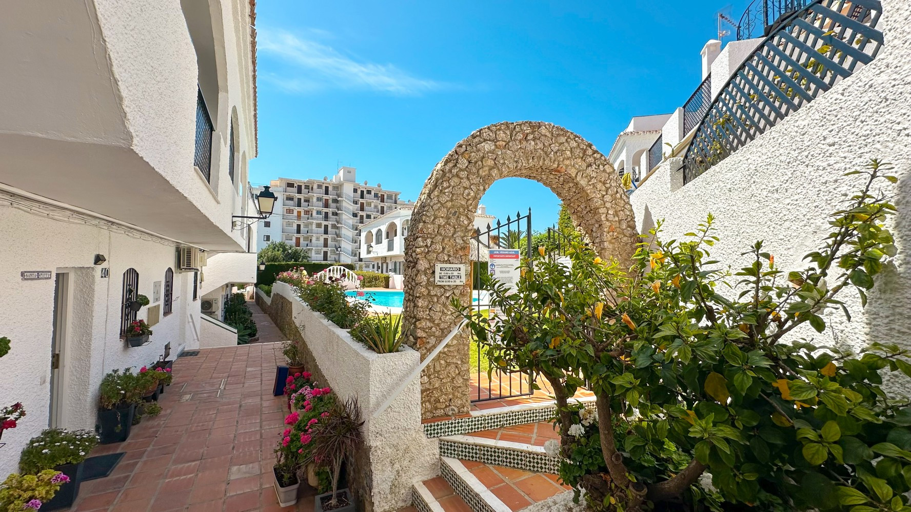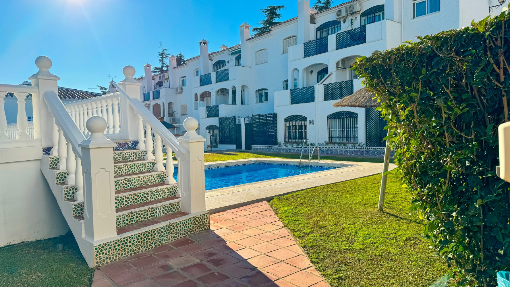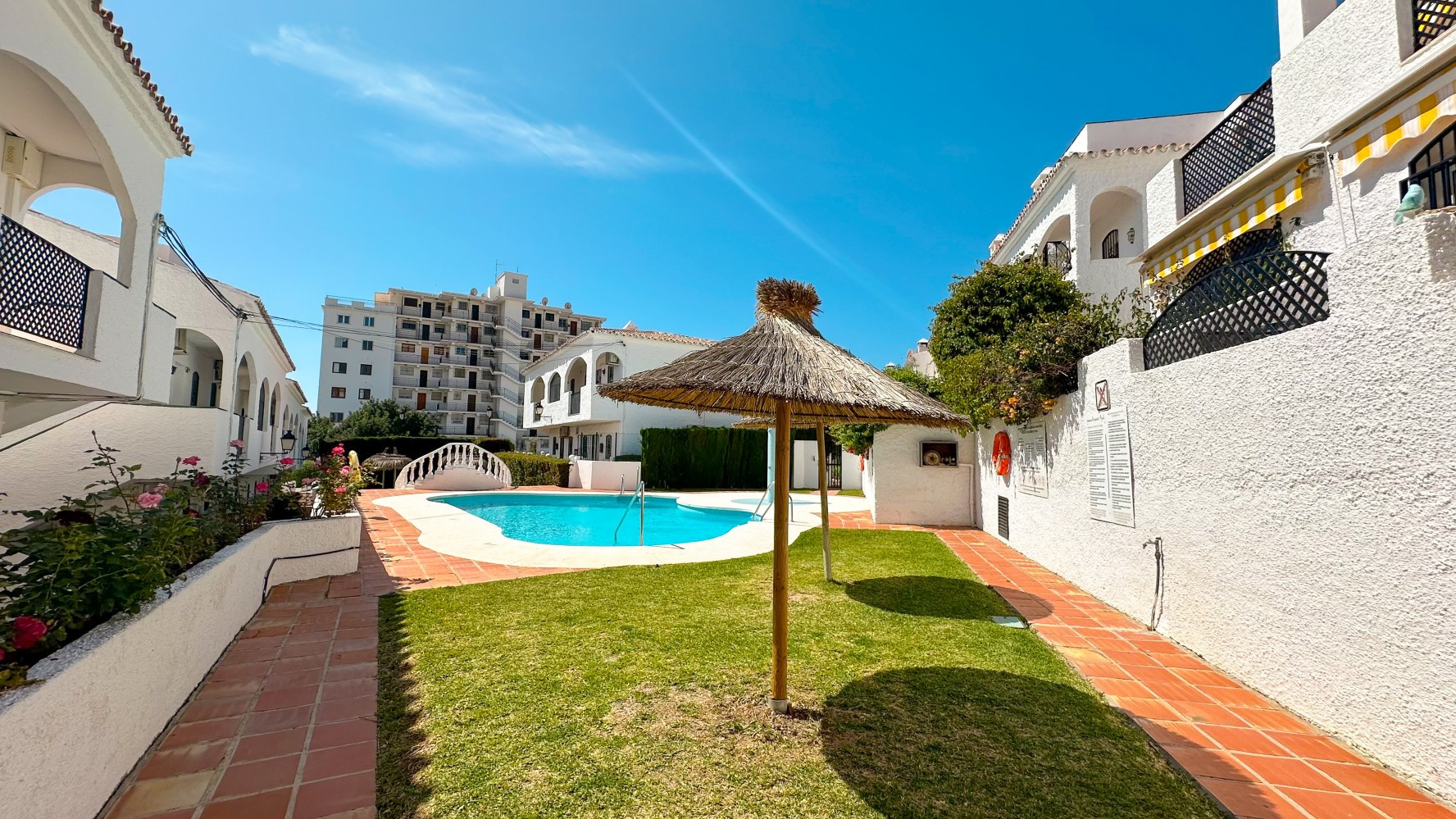 Step outside onto the south-facing terrace, where a built-in barbecue creates the perfect setting for alfresco dining while enjoying Nerjas warm climate. The Verano Azul complex boasts two beautiful communal swimming pools surrounded by lush tropical gardens, offering a tranquil oasis for relaxation.