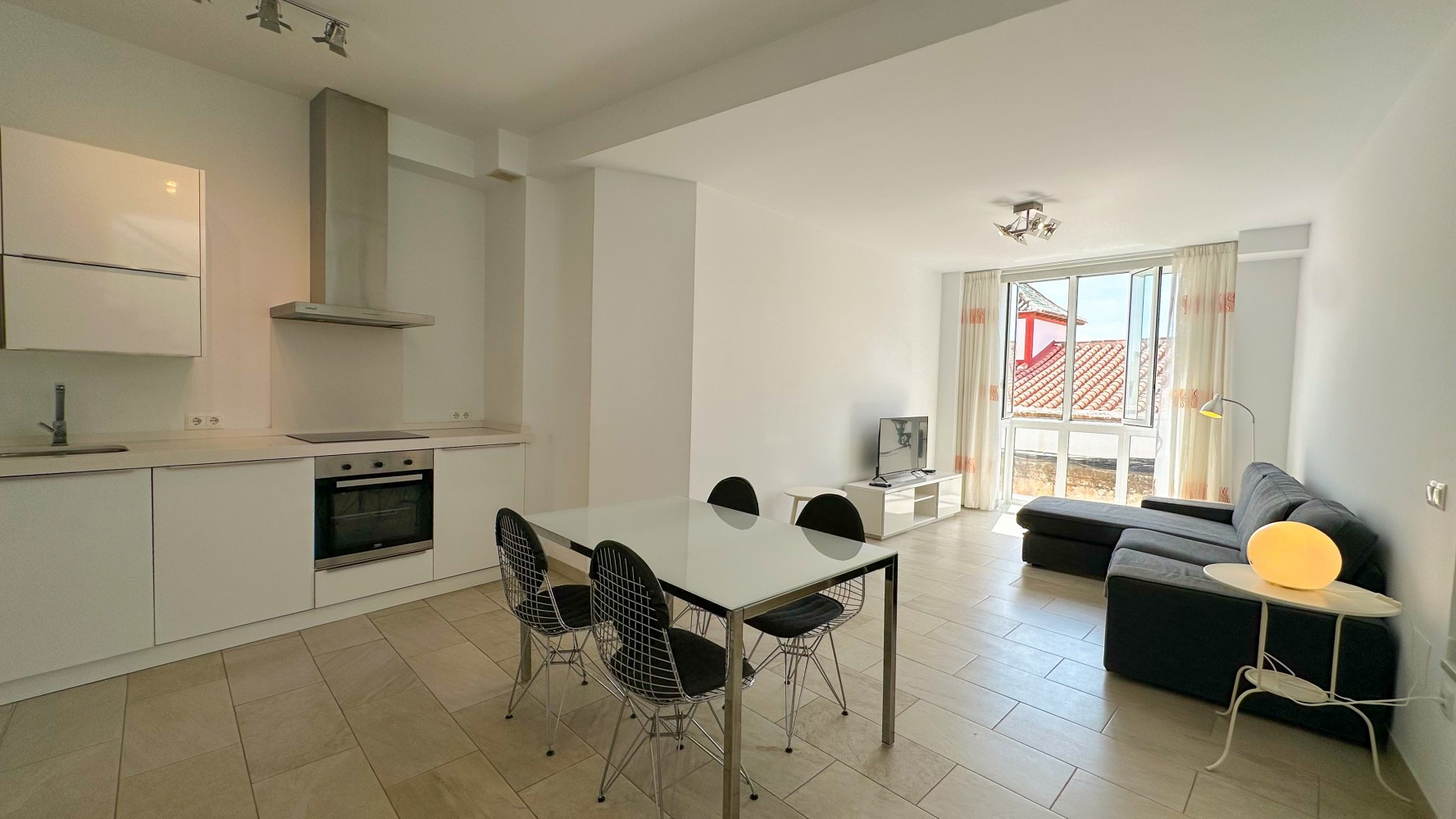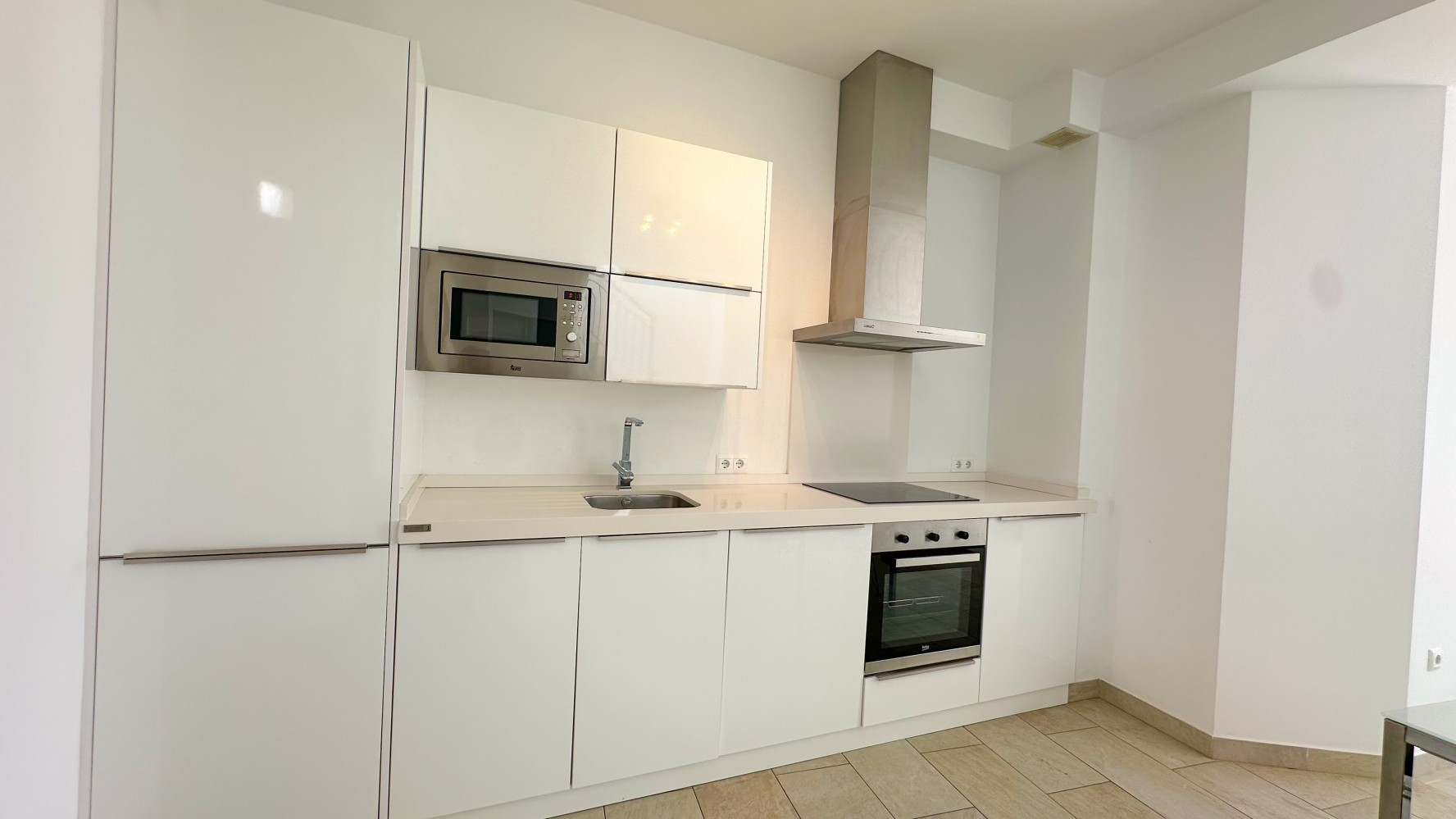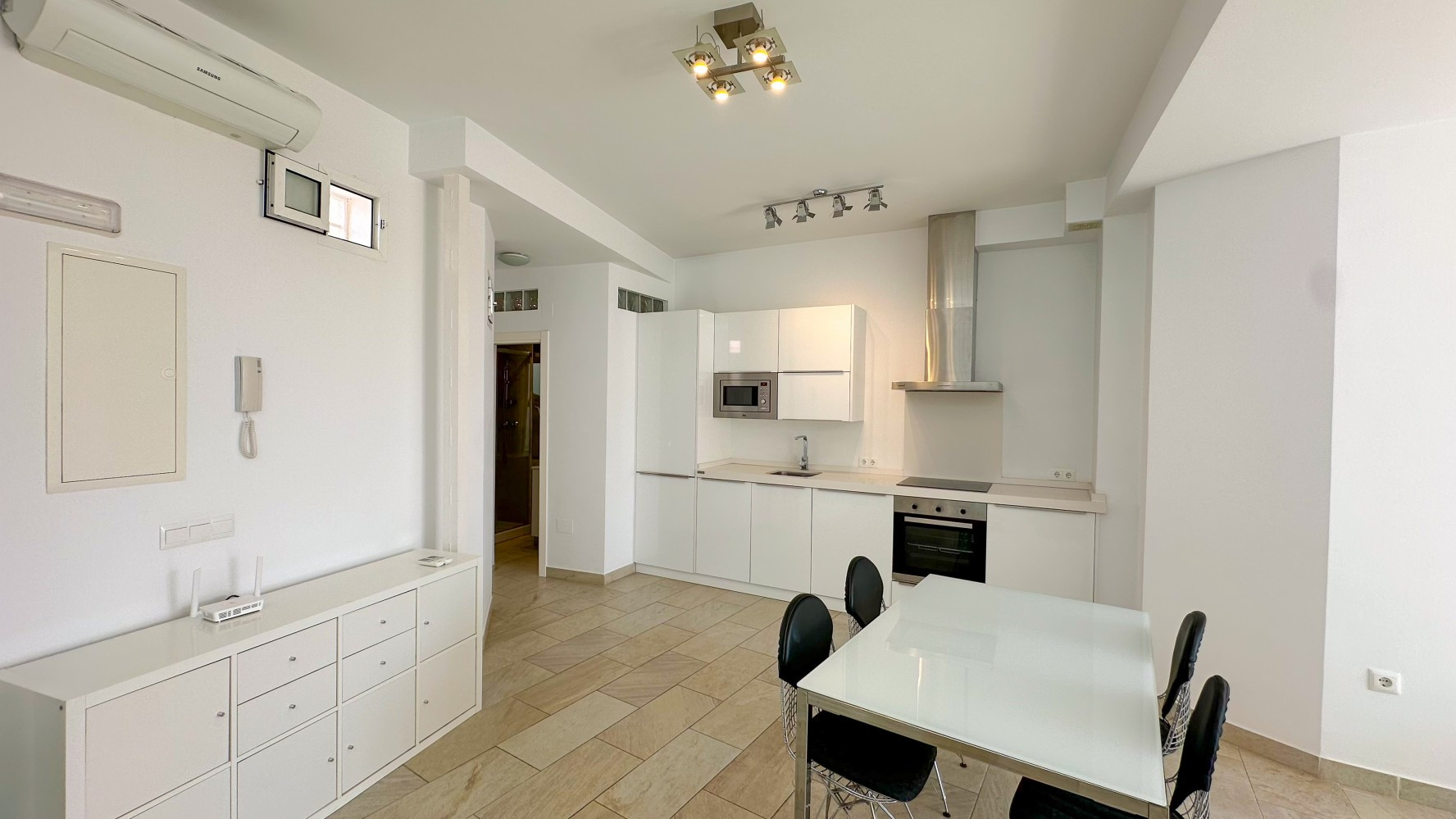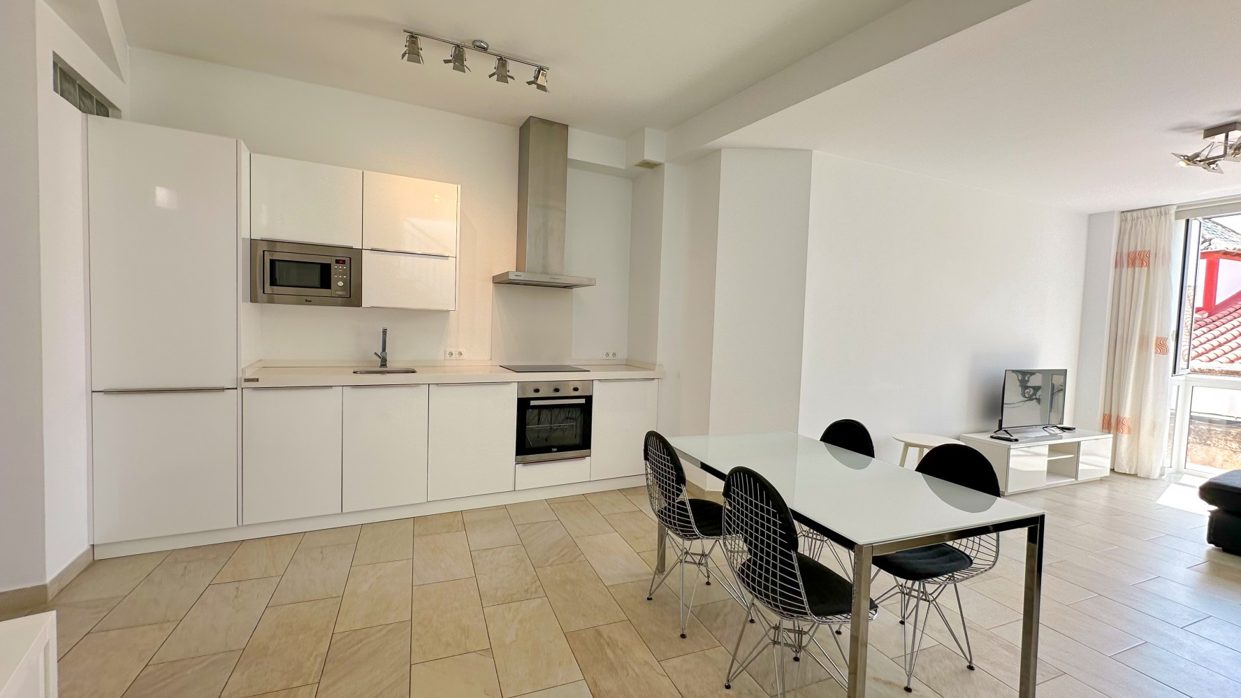 Step into the modern living room flooded with natural light from a large window overlooking the street below. The open-plan kitchen is fully equipped with modern amenities including vitroceramic hob, oven, and microwave.