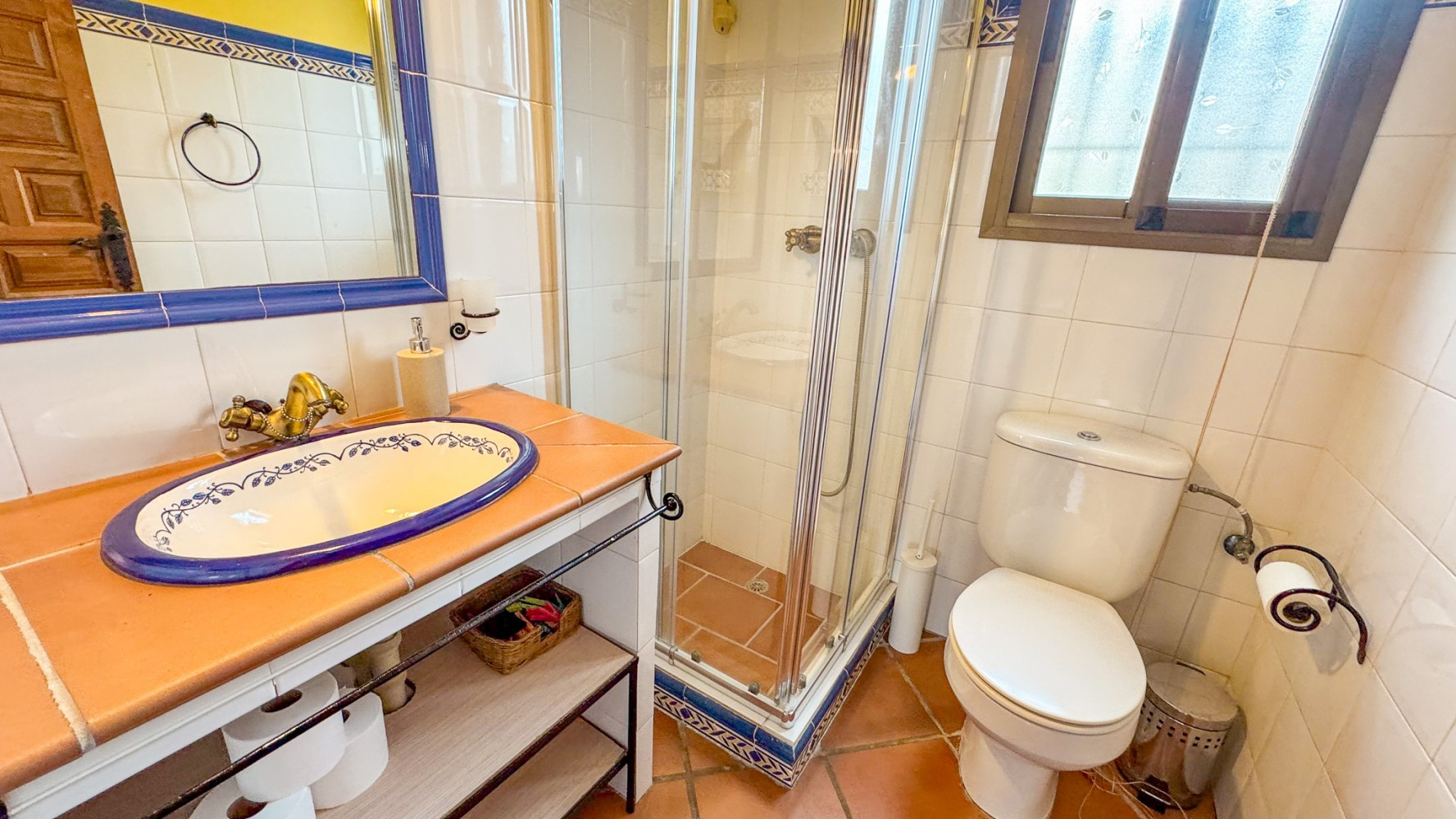 The bathroom, designed in a traditional rustic style, includes a walk-in shower.