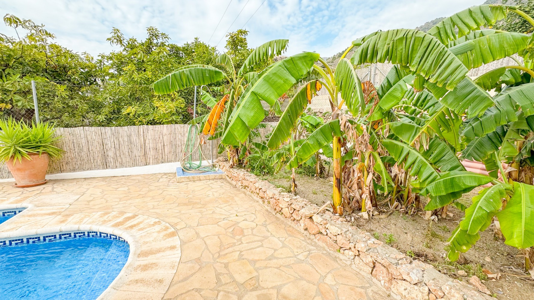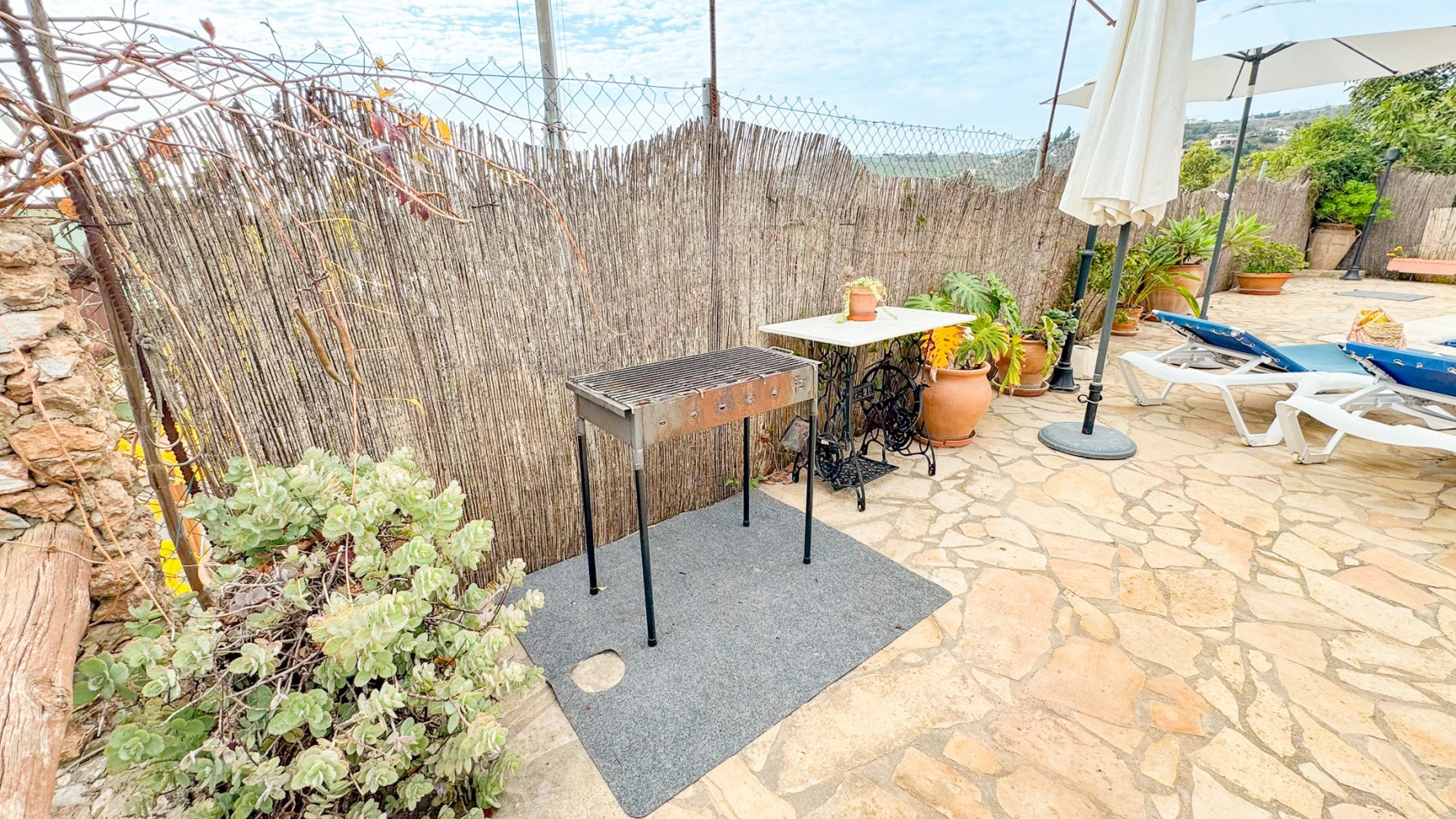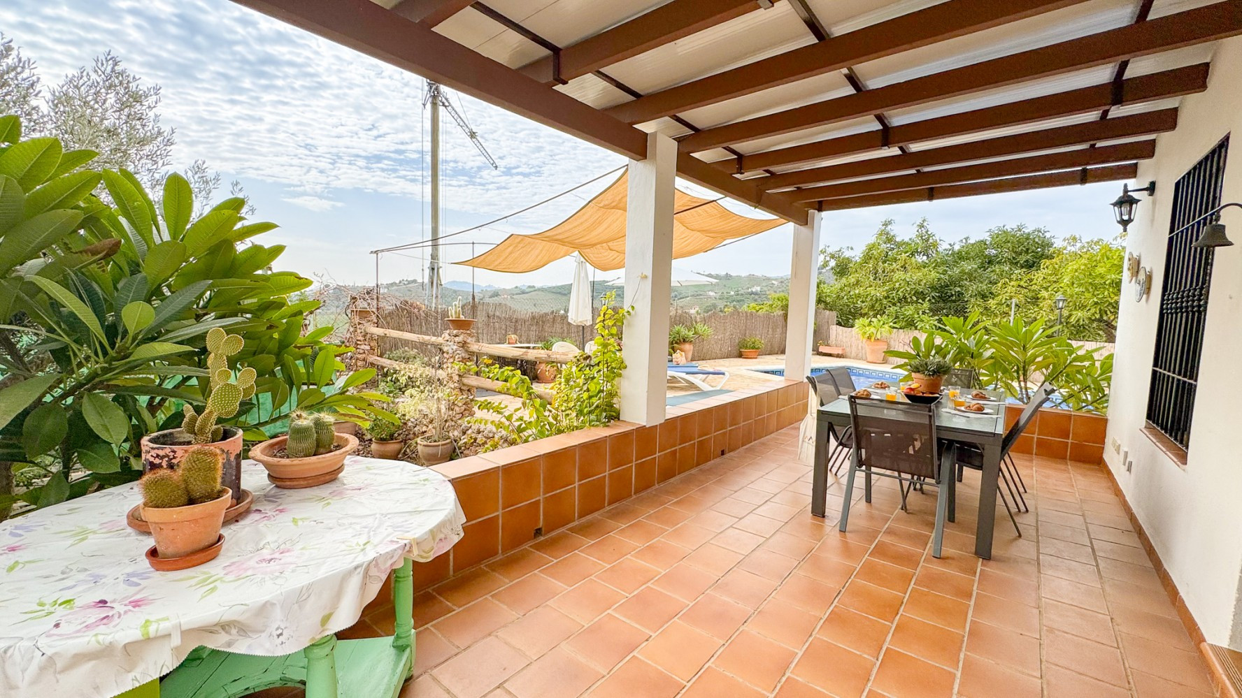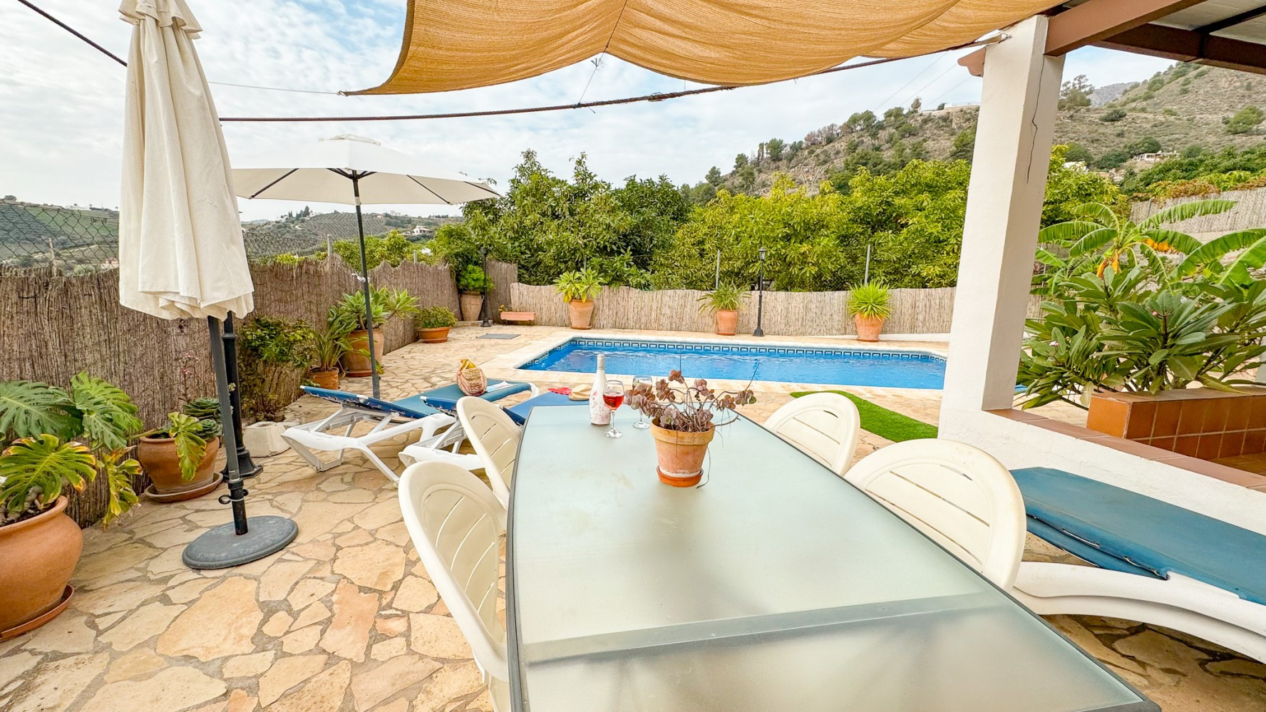 Enjoy the covered porch overlooking the secure fenced pool area. Around the pool side there are sun loungers for 4 and large sun umbrellas. Small Carbon Webber BBQ.