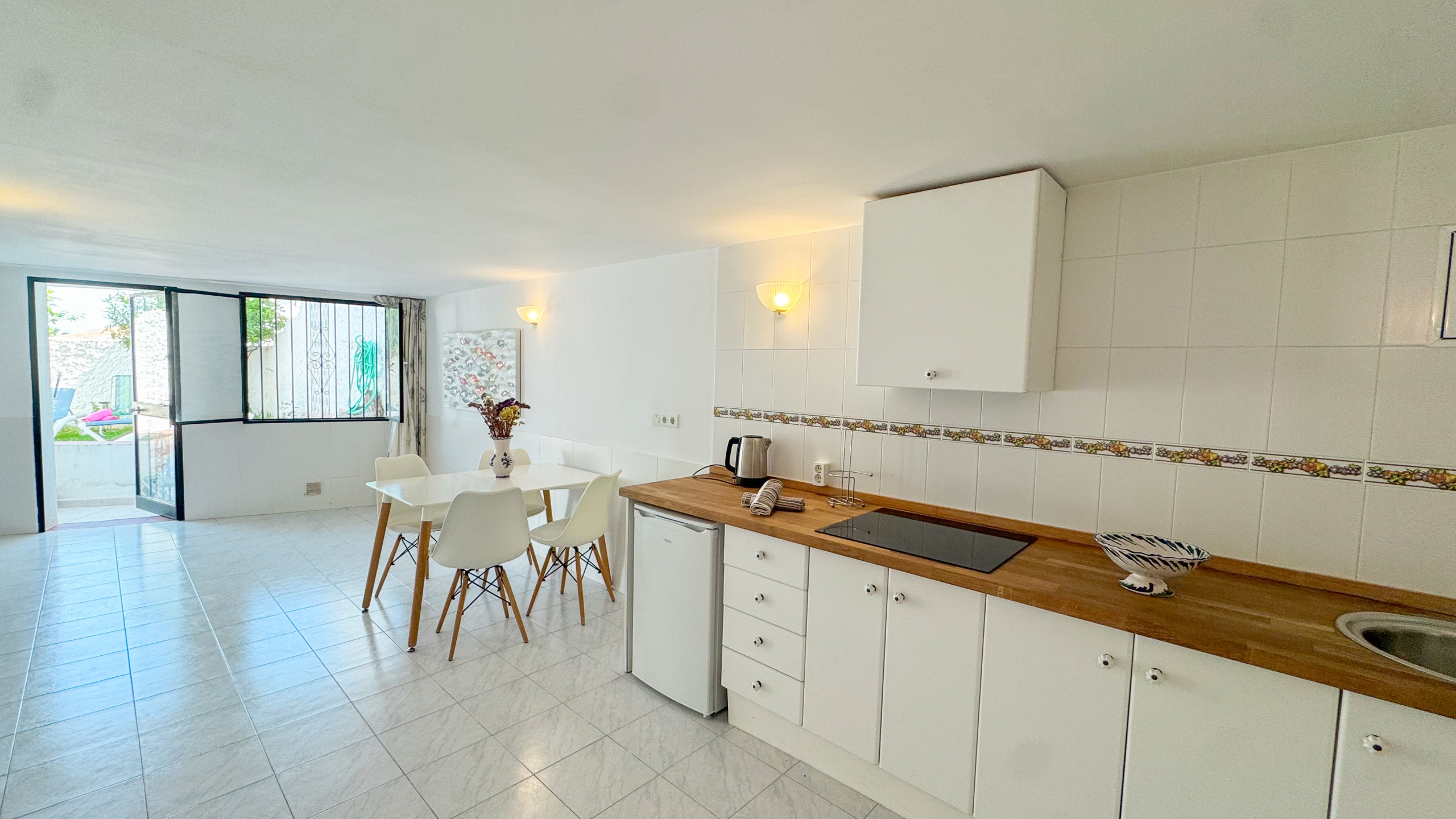 On the first floor there is a bright living room with access to a nice terrace and to a solarium area through some steps. Open plan and fully equipped kitchen and a toilet.