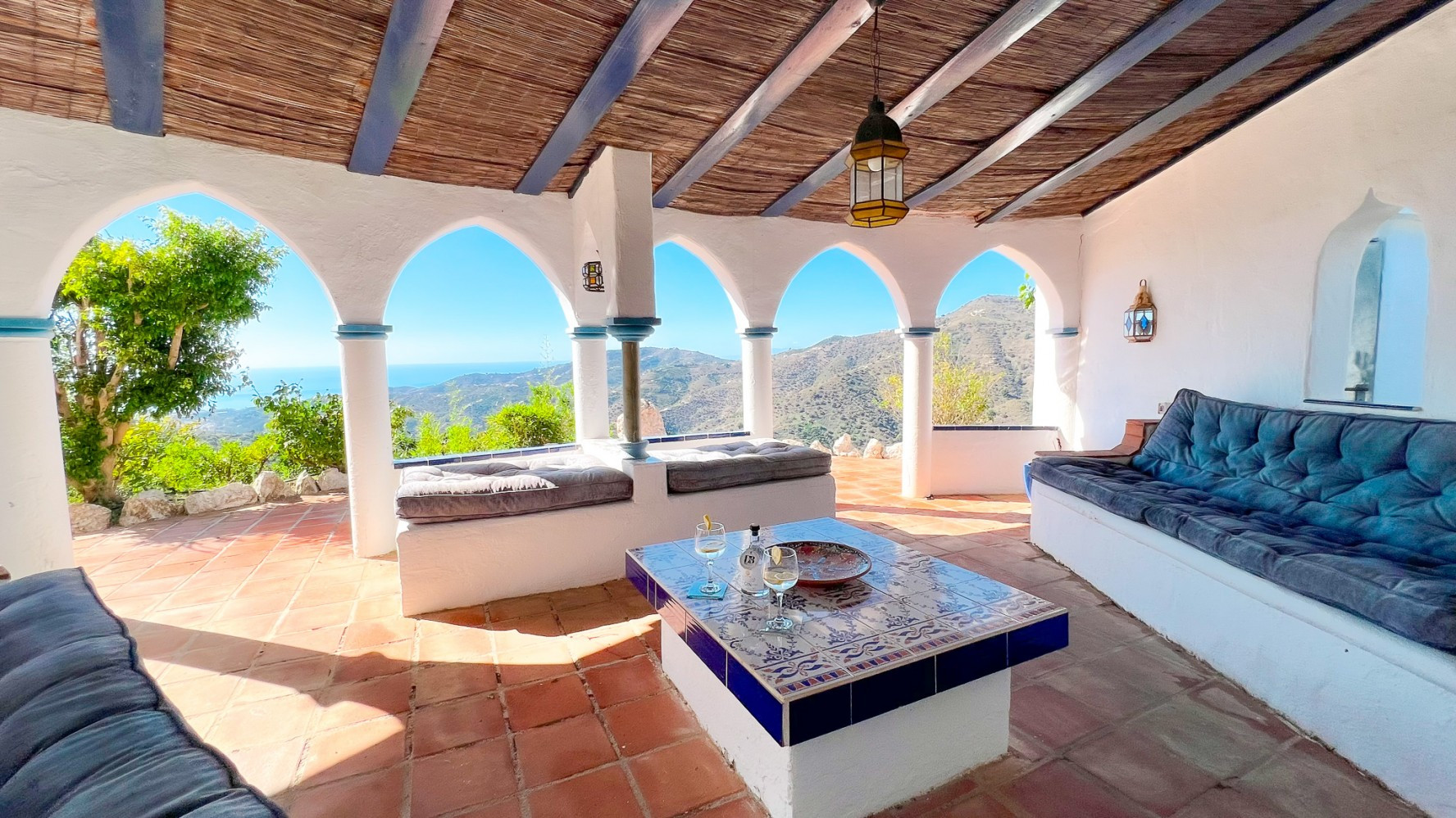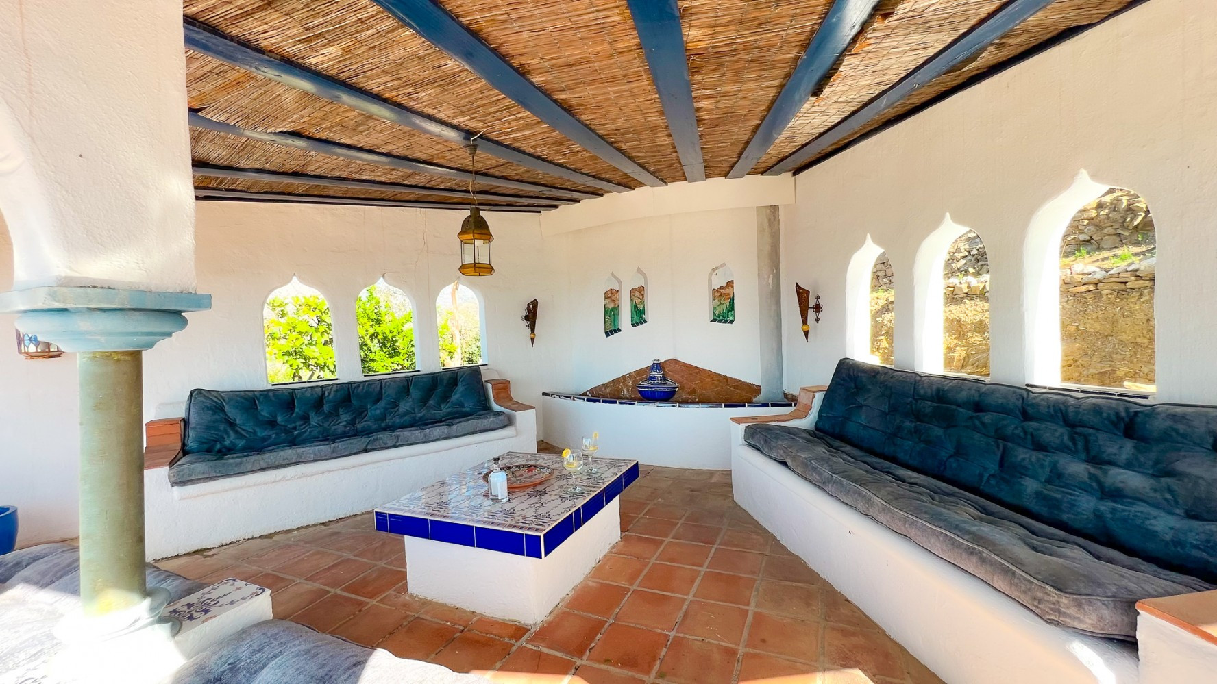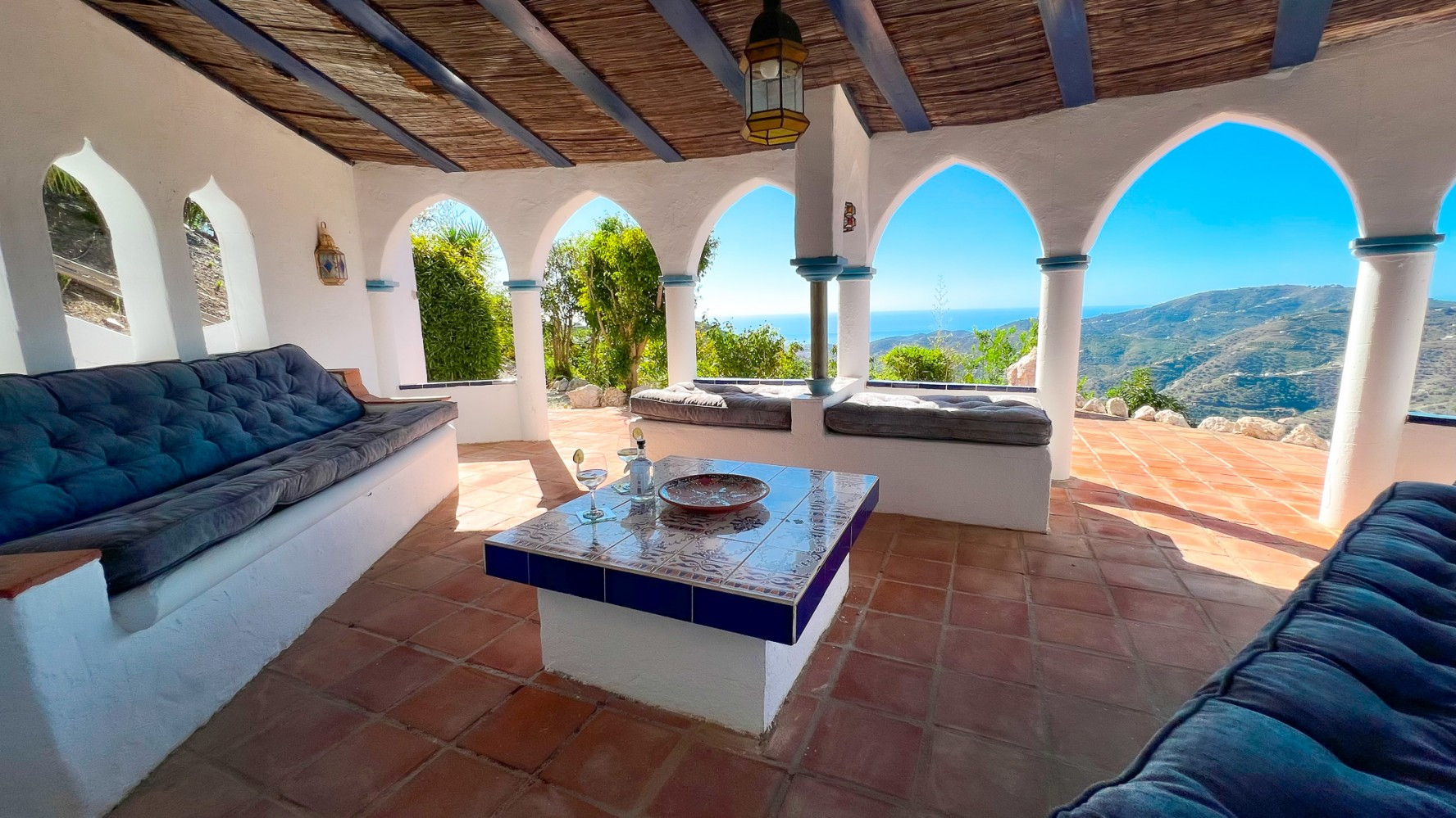 Further steps lead to a spacious relaxation area adorned with Moorish construction and décor, offering breathtaking sea views.